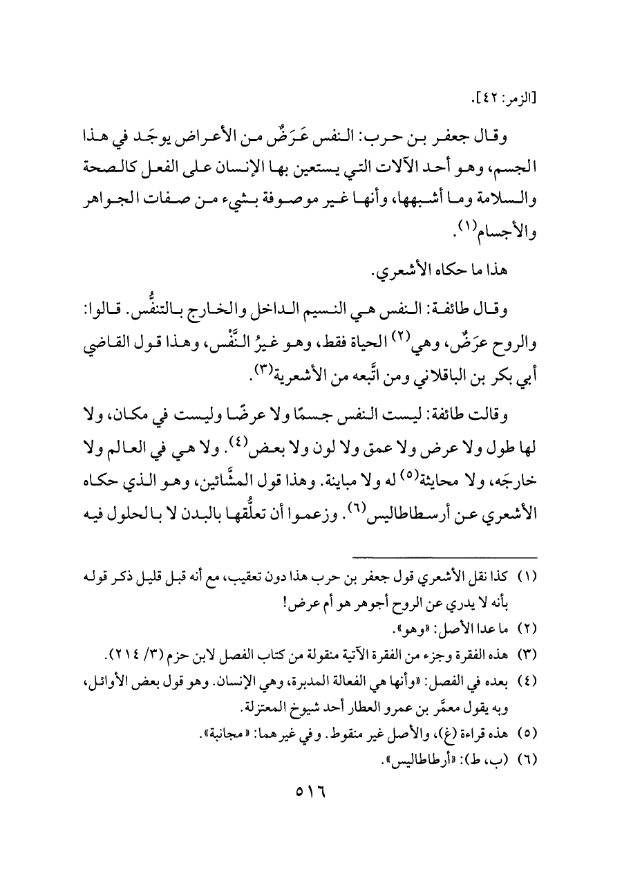 (¬١) كذا نقل الأشعري قول جعفر بن حرب هذا دون تعقيب، مع أنه قبل قليل ذكر قوله بأنه لا يدري عن الروح أجوهر هو أم عرض!