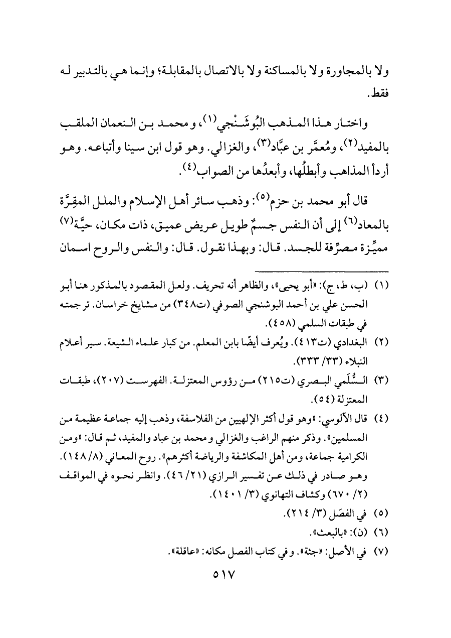 واختار هذا المذهب البُوشَنْجي (¬١)، ومحمد بن النعمان الملقب بالمفيد (¬٢)، ومُعمَّر بن عبَّاد (¬٣)، والغزالي. وهو قول ابن سينا وأتباعه. وهو أردأ المذاهب وأبطلُها، وأبعدُها من الصواب (¬٤).