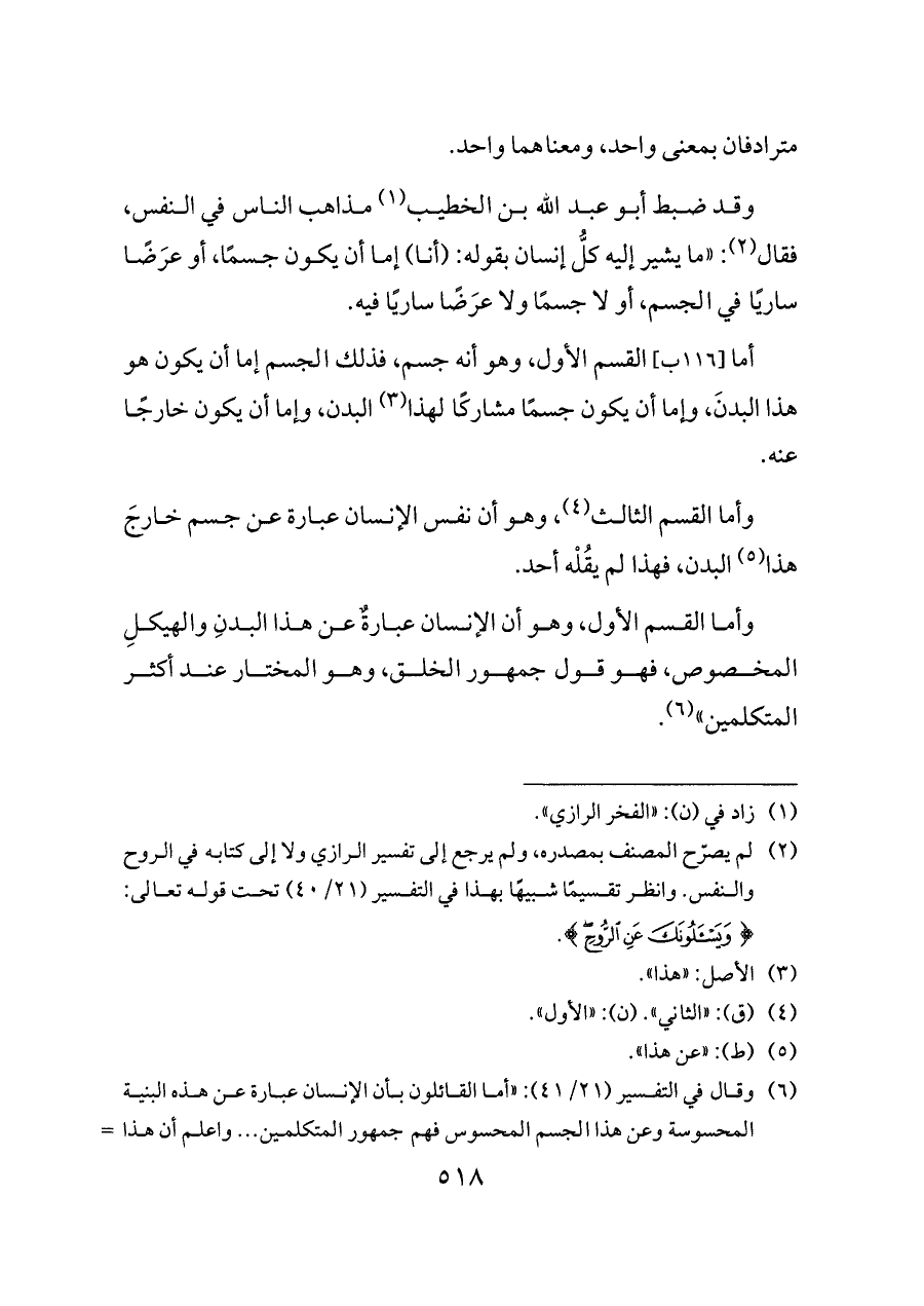 (¬٦) وقال في التفسير (٢١/ ٤١): «أما القائلون بأن الإنسان عبارة عن هذه البنية المحسوسة وعن هذا الجسم المحسوس فهم جمهور المتكلمين ... واعلم أن هذا القول عندنا باطل» وقد أبطله بسبع عشرة حجة نقلية وعقلية.