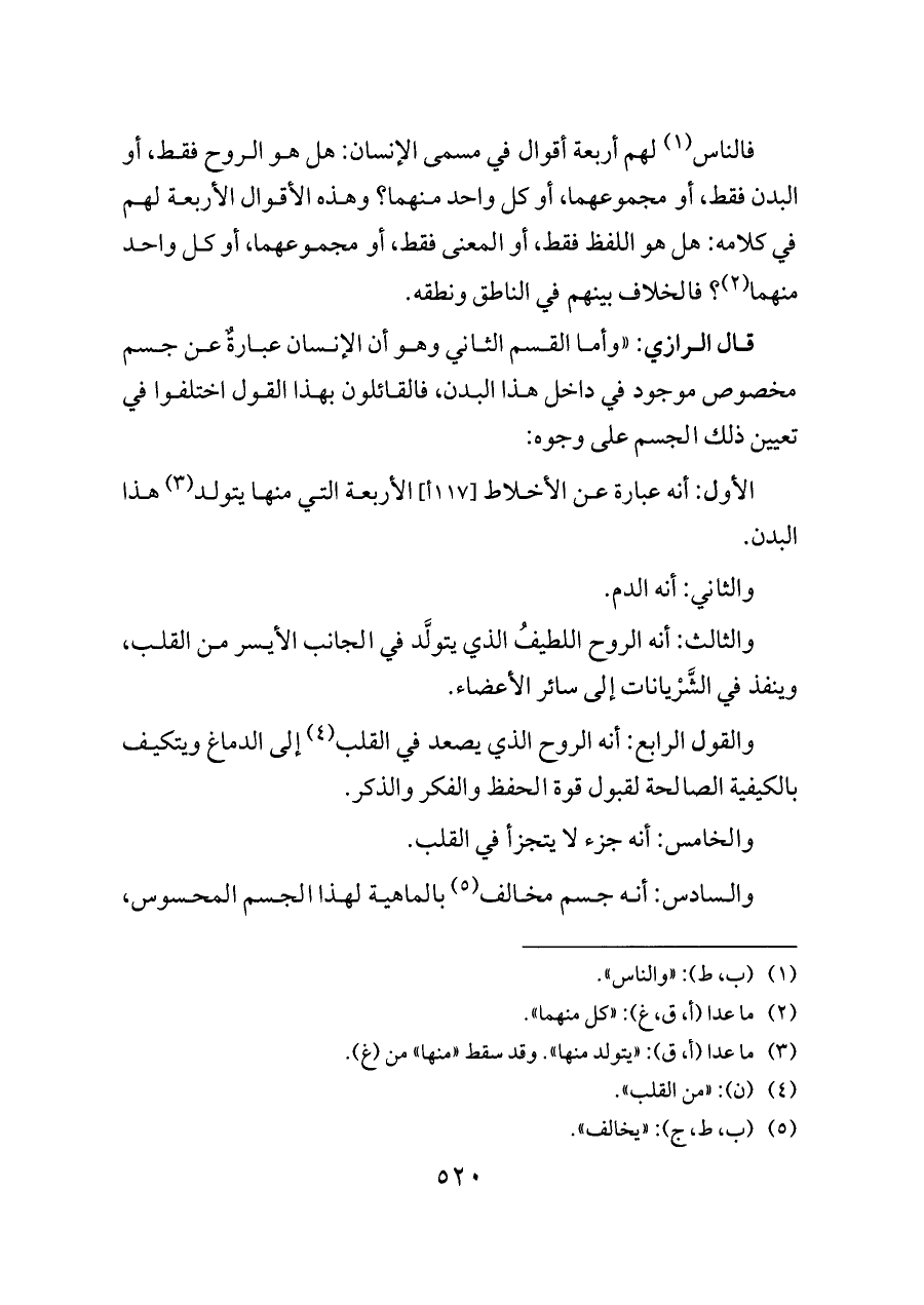 قال الرازي: «وأما القسم الثاني وهو أن الإنسان عبارةٌ عن جسم مخصوص موجود في داخل هذا البدن، فالقائلون بهذا القول اختلفوا في تعيين ذلك الجسم على وجوه: