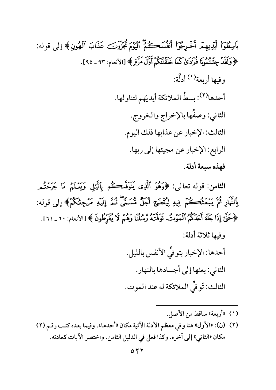 الثامن: قوله تعالى: {وَهُوَ الَّذِي يَتَوَفَّاكُمْ بِاللَّيْلِ وَيَعْلَمُ مَا جَرَحْتُمْ بِالنَّهَارِ ثُمَّ يَبْعَثُكُمْ فِيهِ لِيُقْضَى أَجَلٌ مُسَمًّى ثُمَّ إِلَيْهِ مَرْجِعُكُمْ} إلى قوله: {حَتَّى إِذَا جَاءَ أَحَدَكُمُ الْمَوْتُ تَوَفَّتْهُ رُسُلُنَا وَهُمْ لَا يُفَرِّطُونَ} [الأنعام: ٦٠ ــ ٦١].