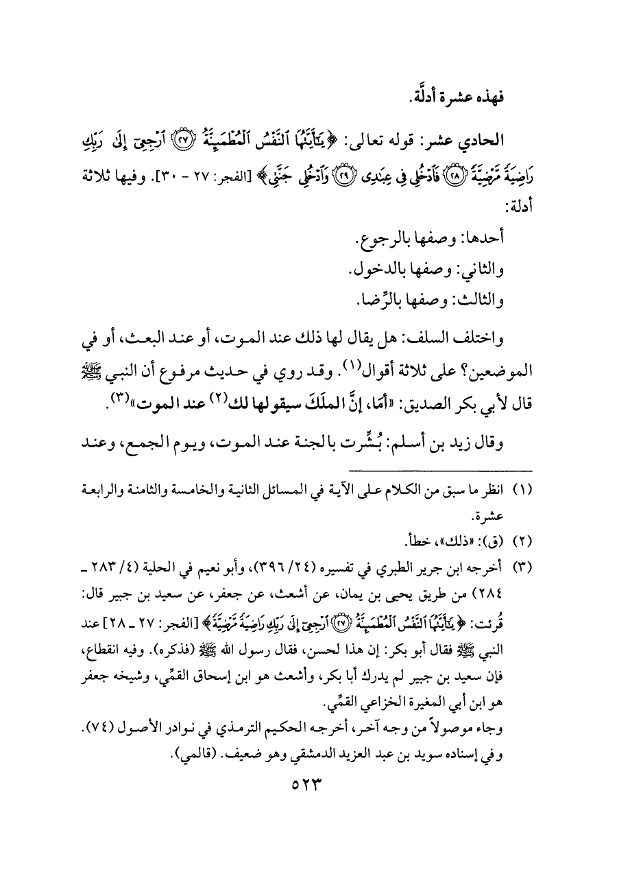 (¬٣) أخرجه ابن جرير الطبري في تفسيره (٢٤/ ٣٩٦)، وأبو نعيم في الحلية (٤/ ٢٨٣ ــ ٢٨٤) من طريق يحيى بن يمان، عن أشعث، عن جعفر، عن سعيد بن جبير قال: قُرئت: {يَاأَيَّتُهَا النَّفْسُ الْمُطْمَئِنَّةُ (٢٧) ارْجِعِي إِلَى رَبِّكِ رَاضِيَةً مَرْضِيَّةً} [الفجر: ٢٧ ــ ٢٨] عند النبي - صلى الله عليه وسلم - فقال أبو بكر: إن هذا لحسن، فقال رسول الله - صلى الله عليه وسلم - (فذكره). وفيه انقطاع، فإن سعيد بن جبير لم يدرك أبا بكر، وأشعث هو ابن إسحاق القمِّي، وشيخه جعفر هو ابن أبي المغيرة الخزاعي القمِّي.