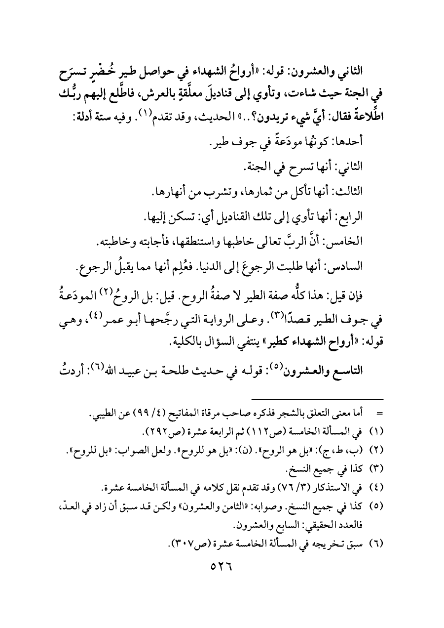 فإن قيل: هذا كلُّه صفة الطير لا صفةُ الروح. قيل: بل الروحُ (¬٢) المودَعةُ في جوف الطير قصدًا (¬٣). وعلى الرواية التي رجَّحها أبو عمر (¬٤)، وهي قوله: «أرواح الشهداء كطير» ينتفي السؤال بالكلية.