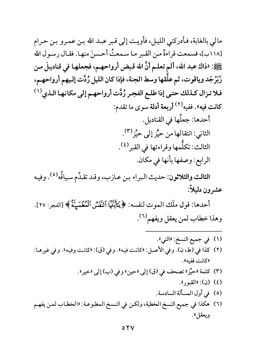 مالي بالغابة، فأدركني الليل، فأويت إلى قبر عبد الله بن عمرو بن حرام [١١٨ ب]، فسمعت قراءةً من القبر ما سمعتُ أحسنَ منها. فقال رسول الله - صلى الله عليه وسلم -: «ذاك عبد الله، ألم تعلم أنَّ الله قبض أرواحهم، فجعلها في قناديلَ من زَبَرْجَد وياقوت، ثم علَّقها وسط الجنة، فإذا كان الليل رُدَّت إليهم أرواحهم، فلا تزال كذلك حتى إذا طلع الفجر رُدَّت أرواحهم إلى مكانها الذي (¬١) كانت فيه». ففيه (¬٢) أربعة أدلة سوى ما تقدم: