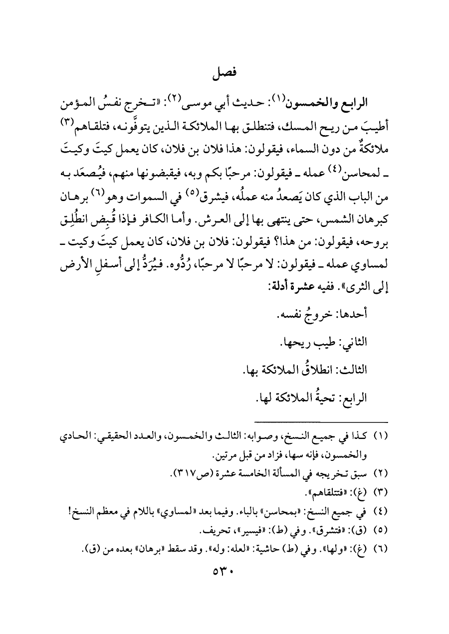 الرابع والخمسون (¬١): حديث أبي موسى (¬٢): «تخرج نفسُ المؤمن أطيبَ من ريح المسك، فتنطلق بها الملائكة الذين يتوفَّونه، فتلقاهم (¬٣) ملائكةٌ من دون السماء، فيقولون: هذا فلان بن فلان، كان يعمل كيتَ وكيتَ ــ لمحاسن (¬٤) عمله ــ فيقولون: مرحبًا بكم وبه، فيقبضونها منهم، فيُصعَد به من الباب الذي كان يَصعدُ منه عملُه، فيشرق (¬٥) في السموات وهو (¬٦) برهان كبرهان الشمس، حتى ينتهى بها إلى العرش. وأما الكافر فإذا قُبِض انطُلِق بروحه، فيقولون: من هذا؟ فيقولون: فلان بن فلان، كان يعمل كيتَ وكيت ــ لمساوي عمله ــ فيقولون: لا مرحبًا لا مرحبًا، رُدُّوه. فيُرَدُّ إلى أسفلِ الأرض إلى الثرى». ففيه عشرة أدلة: