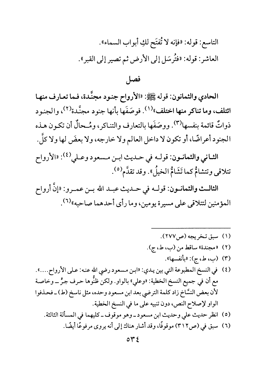 (¬٤) في النسخ المطبوعة التي بين يدي: «ابن مسعود رضي الله عنه: على الأرواح .... ». مع أن في جميع النسخ الخطية: «وعلي» بالواو. ولكن ظنُّوها حرف جرٍّ ــ وخاصة لأن بعض النسَّاخ زاد كلمة الترضي بعد ابن مسعود وحده، مثل ناسخ (ط) ــ فحذفوا الواو لإصلاح النص، دون تنبيه على ما في النسخ الخطية.