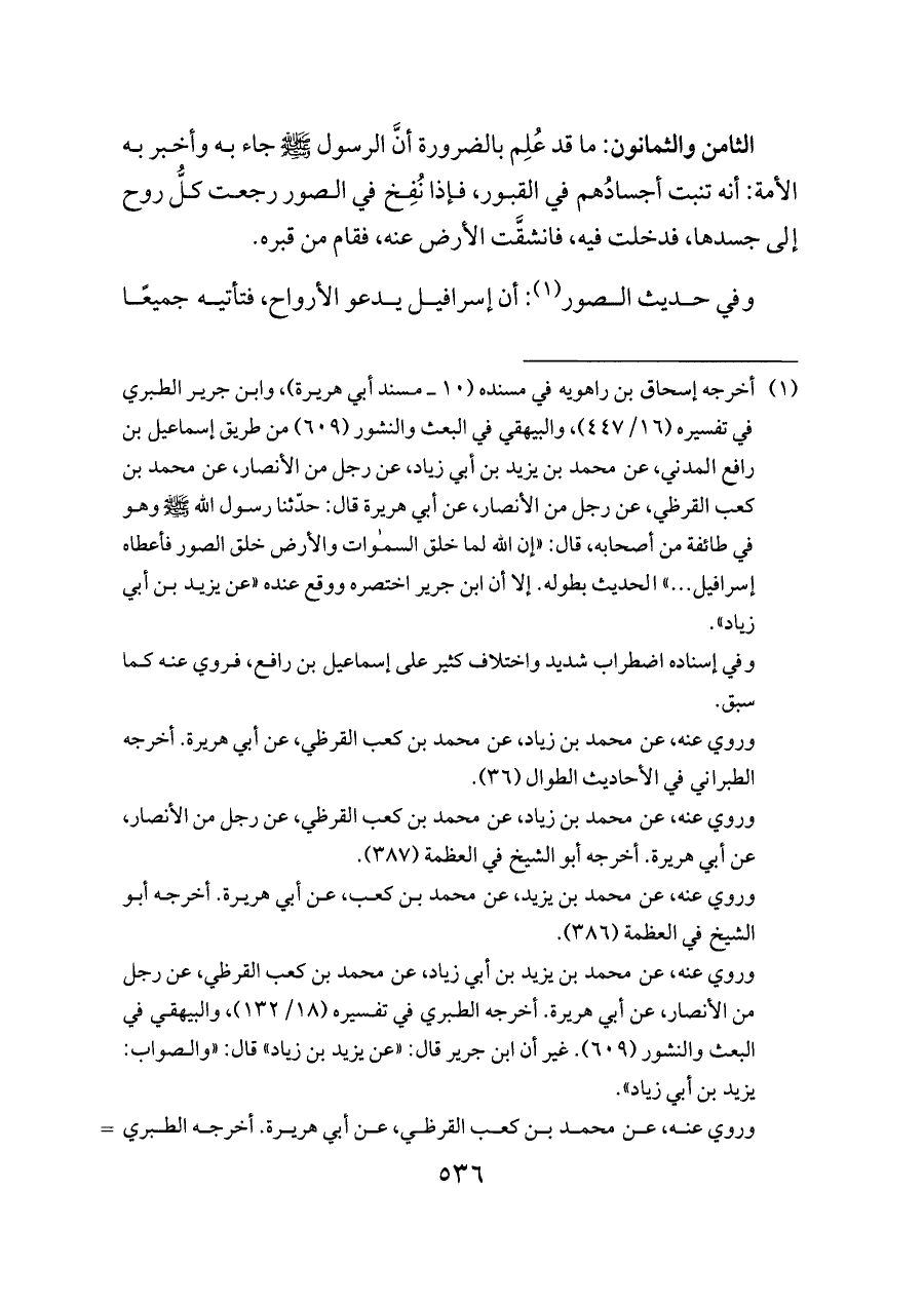الثامن والثمانون: ما قد عُلِم بالضرورة أنَّ الرسول - صلى الله عليه وسلم - جاء به وأخبر به الأمة: أنه تنبت أجسادُهم في القبور، فإذا نُفِخ في الصور رجعت كلُّ روح إلى جسدها، فدخلت فيه، فانشقَّت الأرض عنه، فقام من قبره.