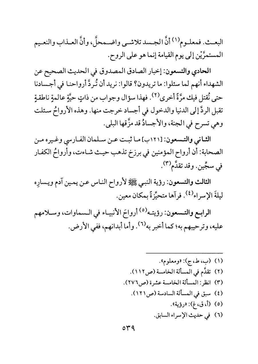 الثاني والتسعون: [١٢١ ب] ما ثبت عن سلمان الفارسي وغيره من الصحابة: أن أرواح المؤمنين في برزخ تذهب حيث شاءت، وأرواحُ الكفار في سجِّين. وقد تقدَّم (¬٣).