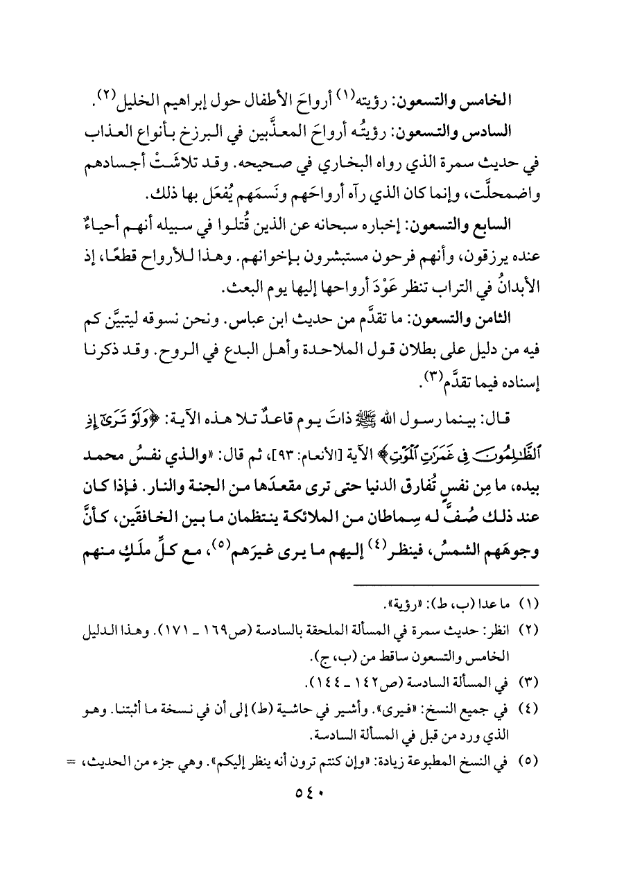 (¬٥) في النسخ المطبوعة زيادة: «وإن كنتم ترون أنه ينظر إليكم». وهي جزء من الحديث، وقد وردت في المسألة السادسة، ولكن لم ترد هنا في شيء من النسخ الخطية التي بين أيدينا.