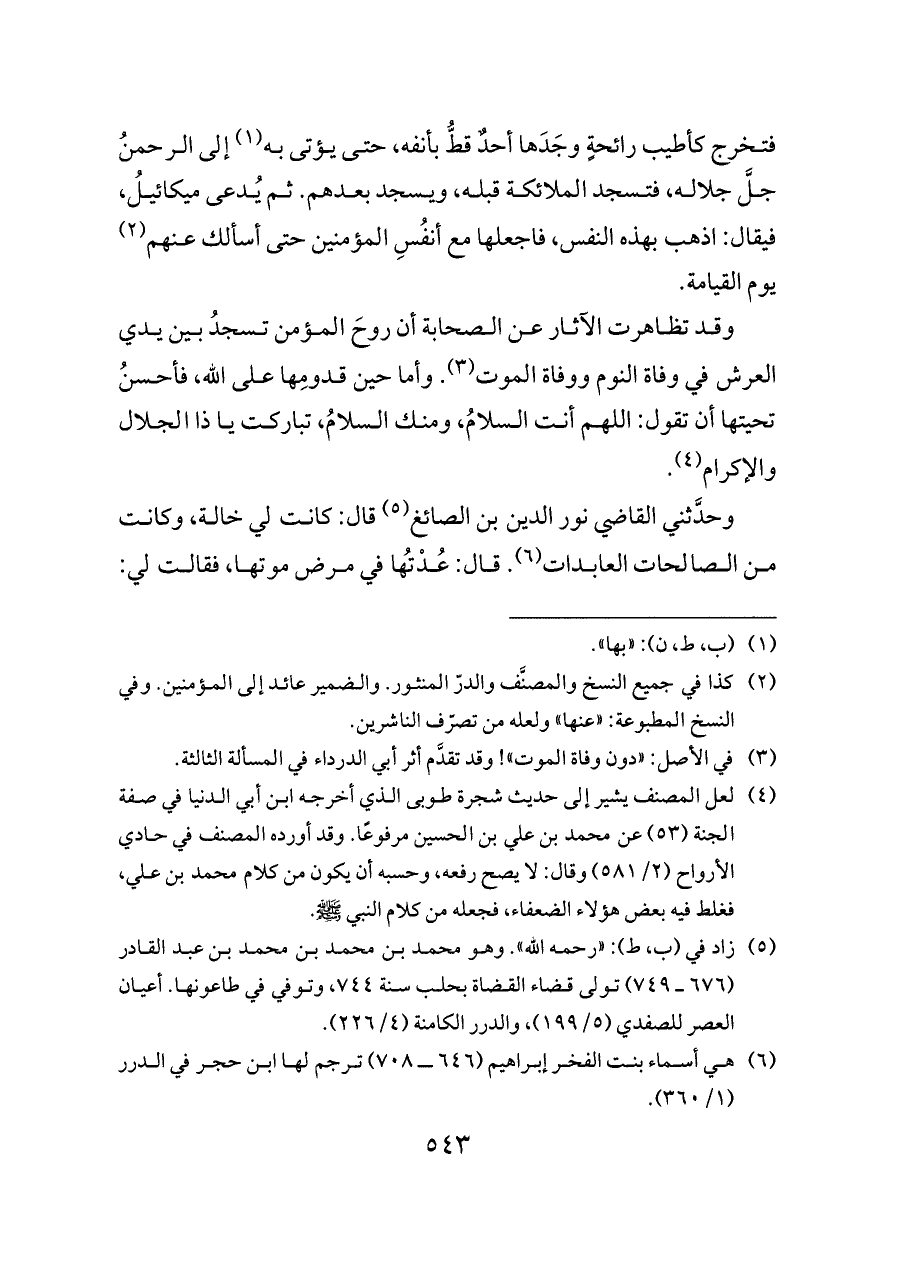 فتخرج كأطيب رائحةٍ وجَدَها أحدٌ قطُّ بأنفه، حتى يؤتى به (¬١) إلى الرحمنُ جلَّ جلاله، فتسجد الملائكة قبله، ويسجد بعدهم. ثم يُدعى ميكائيلُ، فيقال: اذهب بهذه النفس، فاجعلها مع أنفُسِ المؤمنين حتى أسألك عنهم (¬٢) يوم القيامة.