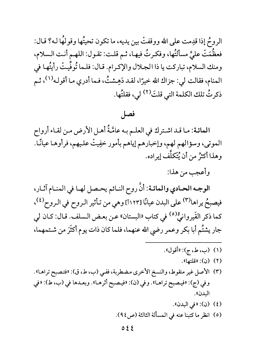 المائة: ما قد اشترك في العلم به عامَّةُ أهل الأرض من لقاء أرواح الموتى، وسؤالهم لهم، وإخبارهم إياهم بأمور خفِيتْ عليهم، فرأوها عيانًا. وهذا أكثرُ من أن يُتَكلَّف إيراده.