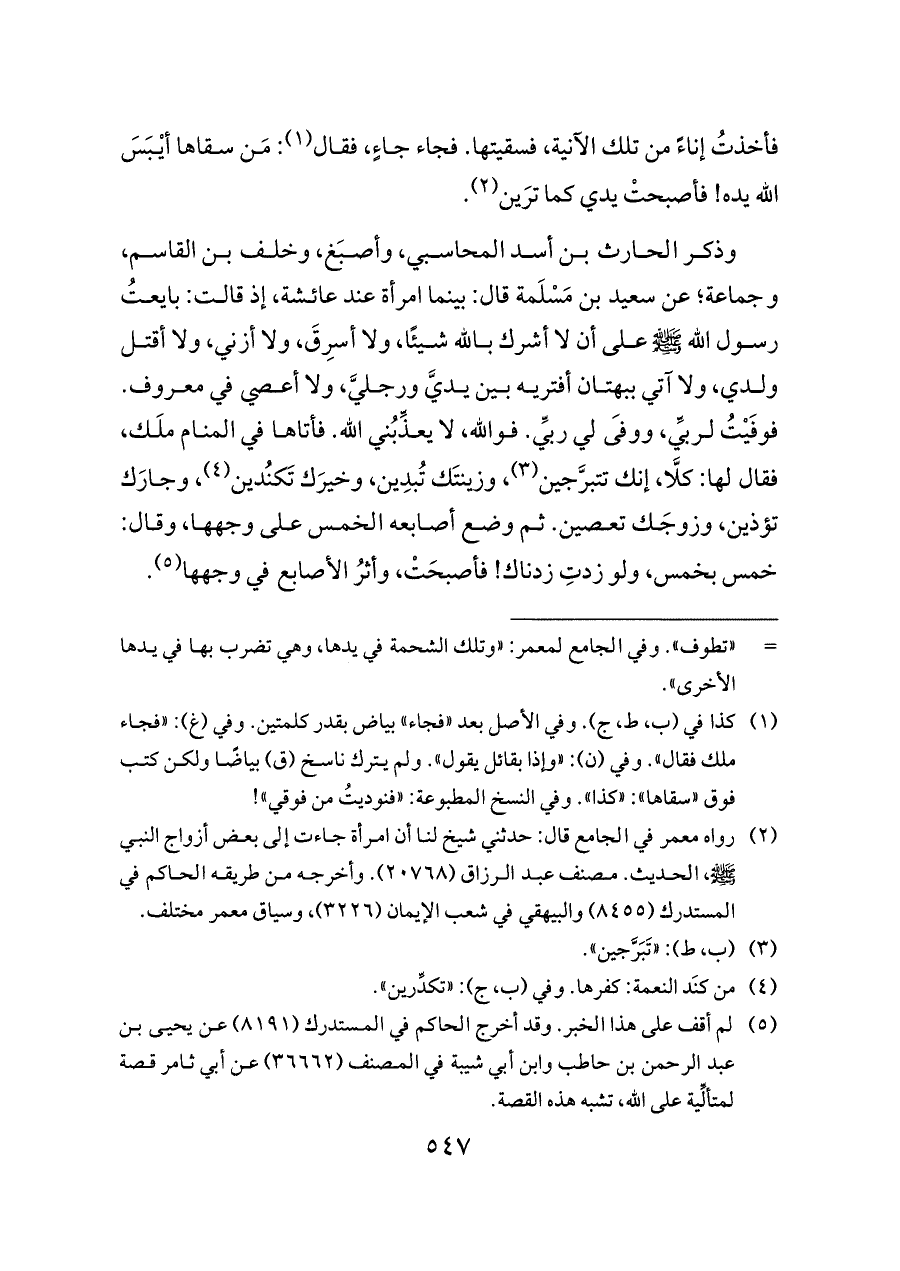 وذكر الحارث بن أسد المحاسبي، وأصبَغ، وخلف بن القاسم، وجماعة؛ عن سعيد بن مَسْلَمة قال: بينما امرأة عند عائشة، إذ قالت: بايعتُ رسول الله - صلى الله عليه وسلم - على أن لا أشرك بالله شيئًا، ولا أسرِقَ، ولا أزني، ولا أقتل ولدي، ولا آتي ببهتان أفتريه بين يديَّ ورجليَّ، ولا أعصي في معروف. فوفَيْتُ لربِّي، ووفَى لي ربِّي. فوالله، لا يعذِّبُني الله. فأتاها في المنام ملَك، فقال لها: كلَّا، إنك تتبرَّجين (¬٣)، وزينتَك تُبدِين، وخيرَك تَكنُدين (¬٤)، وجارَك تؤذين، وزوجَك تعصين. ثم وضع أصابعه الخمس على وجهها، وقال: خمس بخمس، ولو زدتِ زدناك! فأصبحَتْ، وأثرُ الأصابع في وجهها (¬٥).
