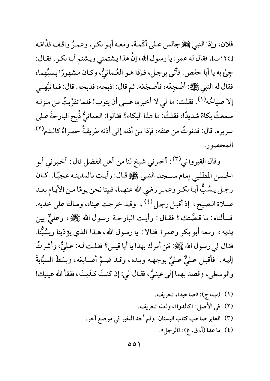 فلان، وإذا النبي - صلى الله عليه وسلم - جالس على أكَمة، ومعه أبو بكر، وعمرُ واقف قدَّامَه [١٢٤ ب]. فقال له عمر: يا رسول الله، إنَّ هذا يشتمني ويشتم أبا بكر. فقال: جِئْ به يا أبا حفص. فأتَى برجل، فإذا هو العُمانيُّ، وكان مشهورًا بسبِّهما، فقال له النبي - صلى الله عليه وسلم -: أضْجِعْه، فأضجَعَه. ثم قال: اذبحه، فذبحه. قال: فما نبَّهني إلا صياحُه (¬١). فقلت: ما لي لا أخبره، عسى أن يتوب! فلما تقرَّبتُ من منزله سمعتُ بكاءً شديدًا، فقلتُ: ما هذا البكاء؟ فقالوا: العمانيُّ ذُبِح البارحةَ على سريره. قال: فدنوتُ من عنقه، فإذا من أذنه إلى أذنه طريقةٌ حمراءُ كالدم (¬٢) المحصور.