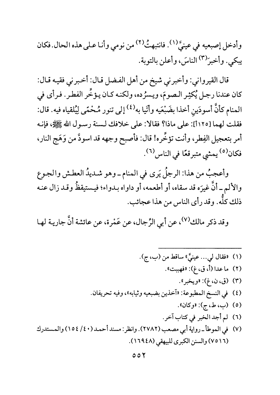 قال القيرواني: وأخبرني شيخ من أهل الفضل قال: أخبرني فقيه قال: كان عندنا رجل يُكثِر الصومَ، ويسرُده، ولكنه كان يؤخِّر الفطر. فرأى في المنام كأنَّ أسودَينِ أخذا بضَبْعَيه وأتَيا به (¬٤) إلى تنور مُحْمًى لِيُلقياه فيه. قال: فقلت لهما [١٢٥ أ]: على ماذا؟ فقالا: على خلافك لسنة رسول الله - صلى الله عليه وسلم -، فإنه أمر بتعجيل الفِطر، وأنت تؤخِّره! قال: فأصبح وجهه قد اسودَّ من وَهَج النار، فكان (¬٥) يمشي متبرقعًا في الناس (¬٦).