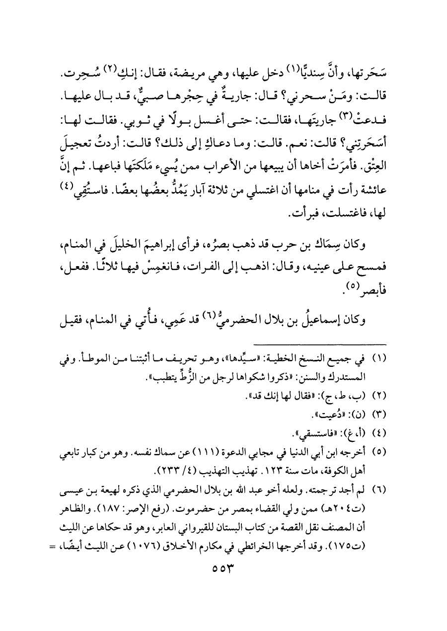 سَحَرتها، وأنَّ سِنديًّا (¬١) دخل عليها، وهي مريضة، فقال: إنكِ (¬٢) سُحِرت. قالت: ومَنْ سحرني؟ قال: جاريةٌ في حِجْرها صبيٌّ، قد بال عليها. فدعتْ (¬٣) جاريتَها، فقالت: حتى أغسل بولًا في ثوبي. فقالت لها: أسَحَرتِني؟ قالت: نعم. قالت: وما دعاكِ إلى ذلك؟ قالت: أردتُ تعجيلَ العِتْق. فأمرَتْ أخاها أن يبيعها من الأعراب ممن يُسيء مَلَكتَها فباعها. ثم إنَّ عائشة رأت في منامها أن اغتسلي من ثلاثة آبار يَمُدُّ بعضُها بعضًا. فاستُقِي (¬٤) لها، فاغتسلت، فبرأت.