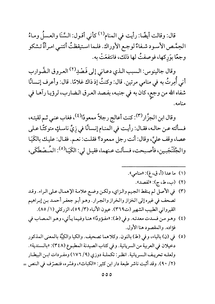 وقال ابن الجزَّار (¬٣): كنت أعالج رجلاً ممعودًا (¬٤)، فغاب عني ثم لقيته، فسألته عن حاله، فقال: رأيت في المنام إنسانًا في زِيِّ ناسكٍ متوكئًا على عصا، وقف عليَّ، وقال: أنت رجل ممعود؟ فقلت: نعم. فقال: عليك بالكَيَا والجُلَنْجَبين، فأصبحت، فسألت عنهما، فقيل لي: الكَيَا (¬٥): المُصْطَكَى،