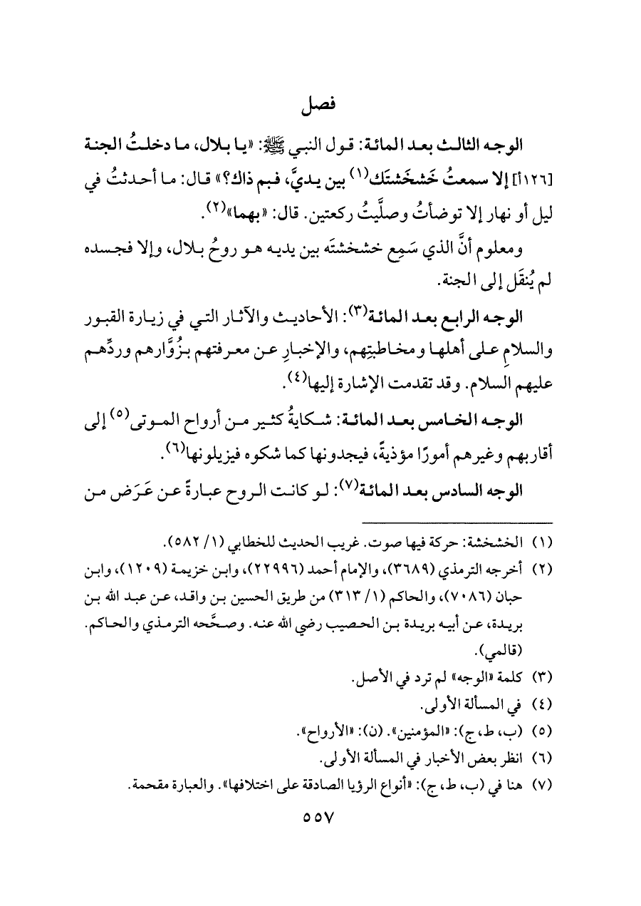 الوجه الرابع بعد المائة (¬٣): الأحاديث والآثار التي في زيارة القبور والسلامِ على أهلها ومخاطبتِهم، والإخبارِ عن معرفتهم بزُوَّارهم وردِّهم عليهم السلام. وقد تقدمت الإشارة إليها (¬٤).