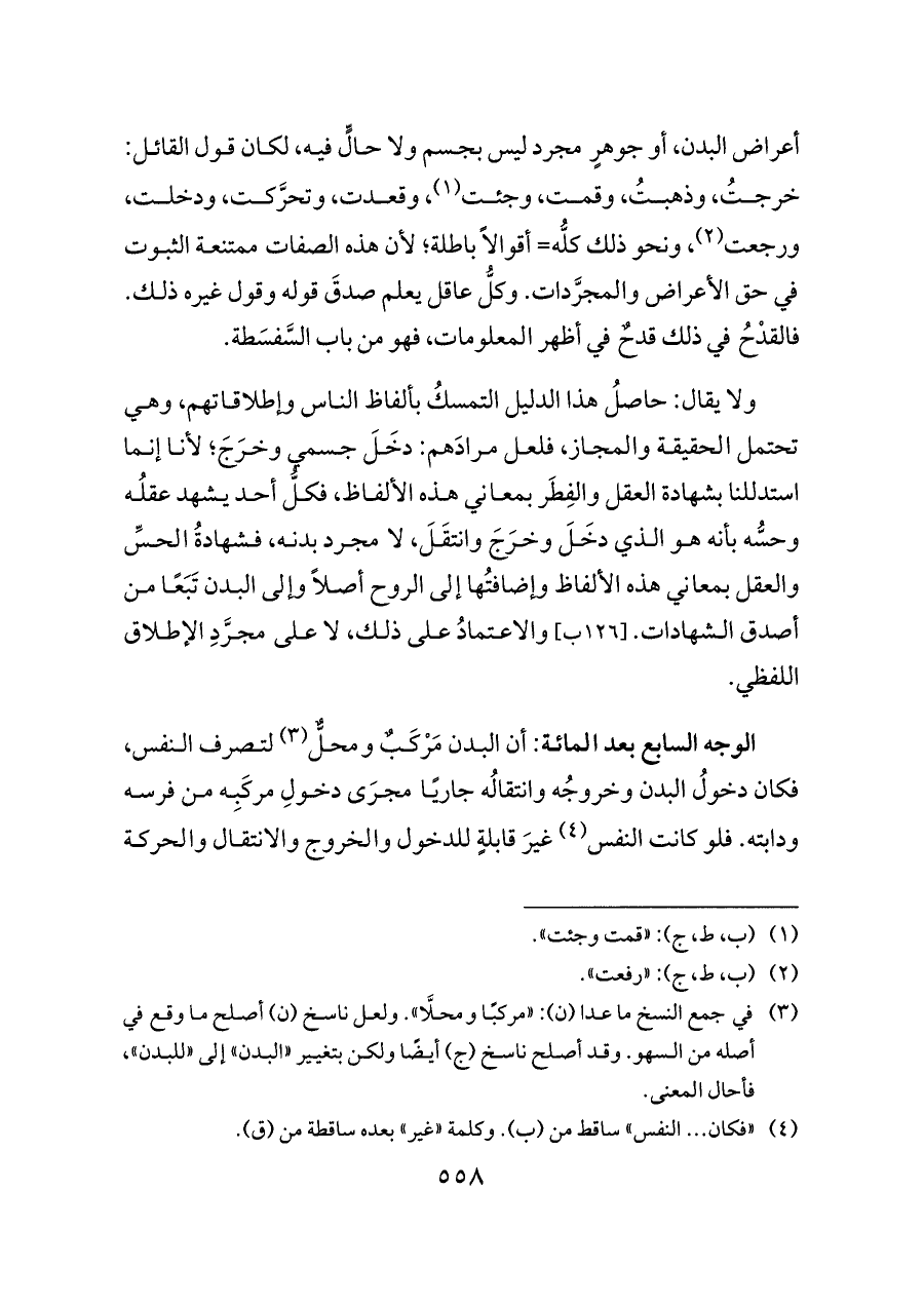 أعراض البدن، أو جوهرٍ مجرد ليس بجسم ولا حالٍّ فيه، لكان قول القائل: خرجتُ، وذهبتُ، وقمت، وجئت (¬١)، وقعدت، وتحرَّكت، ودخلت، ورجعت (¬٢)، ونحو ذلك كلُّه= أقوالاً باطلة؛ لأن هذه الصفات ممتنعة الثبوت في حق الأعراض والمجرَّدات. وكلُّ عاقل يعلم صدقَ قوله وقول غيره ذلك. فالقدْحُ في ذلك قدحٌ في أظهر المعلومات، فهو من باب السَّفسَطة.