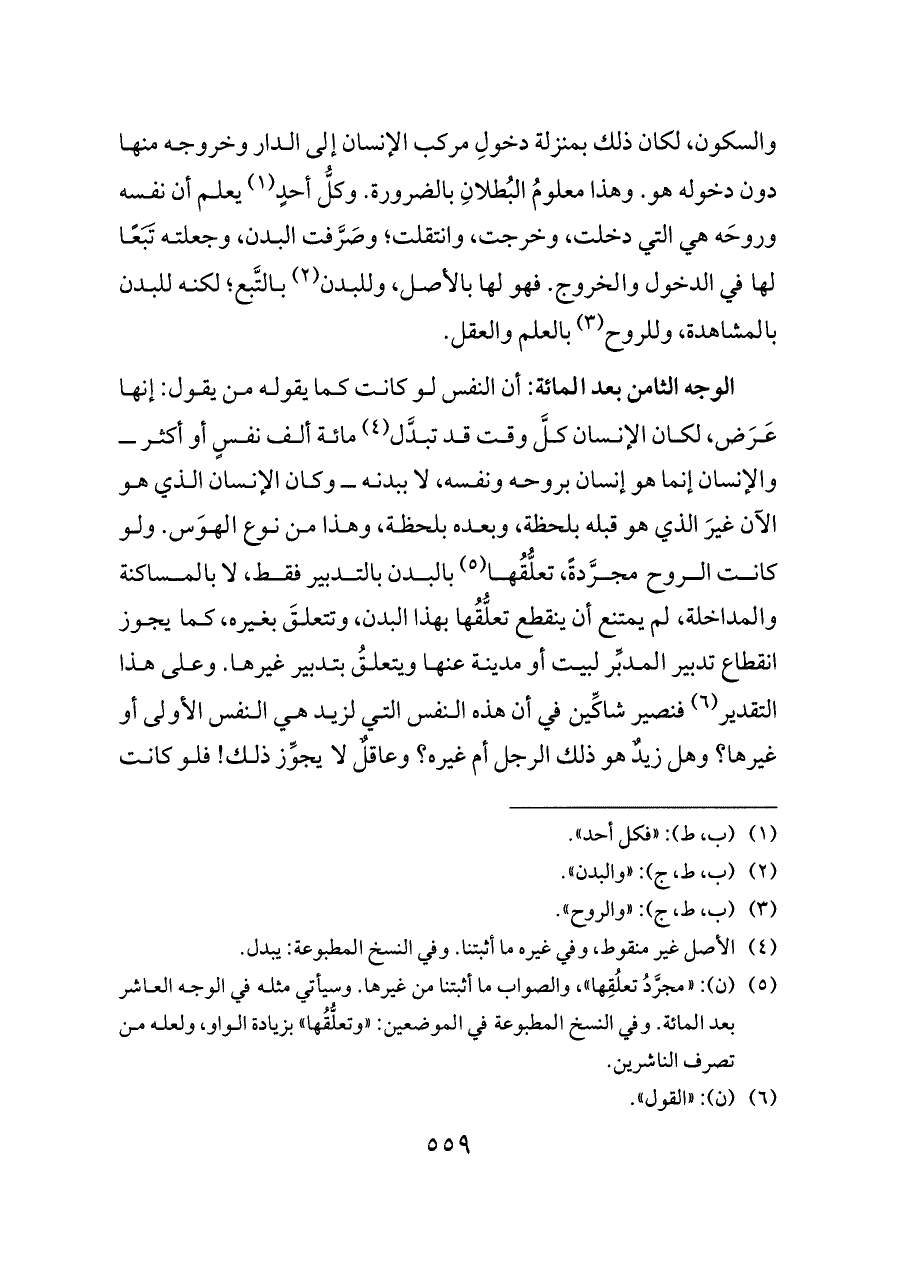الوجه الثامن بعد المائة: أن النفس لو كانت كما يقوله من يقول: إنها عَرَض، لكان الإنسان كلَّ وقت قد تبدَّل (¬٤) مائة ألف نفسٍ أو أكثر ــ والإنسان إنما هو إنسان بروحه ونفسه، لا ببدنه ــ وكان الإنسان الذي هو الآن غيرَ الذي هو قبله بلحظة، وبعده بلحظة، وهذا من نوع الهوَس. ولو كانت الروح مجرَّدةً، تعلُّقُها (¬٥) بالبدن بالتدبير فقط، لا بالمساكنة والمداخلة، لم يمتنع أن ينقطع تعلُّقُها بهذا البدن، وتتعلقَ بغيره، كما يجوز انقطاع تدبير المدبِّر لبيت أو مدينة عنها ويتعلقُ بتدبير غيرها. وعلى هذا التقدير (¬٦) فنصير شاكِّين في أن هذه النفس التي لزيد هي النفس الأولى أو غيرها؟ وهل زيدٌ هو ذلك الرجل أم غيره؟ وعاقلٌ لا يجوِّز ذلك! فلو كانت