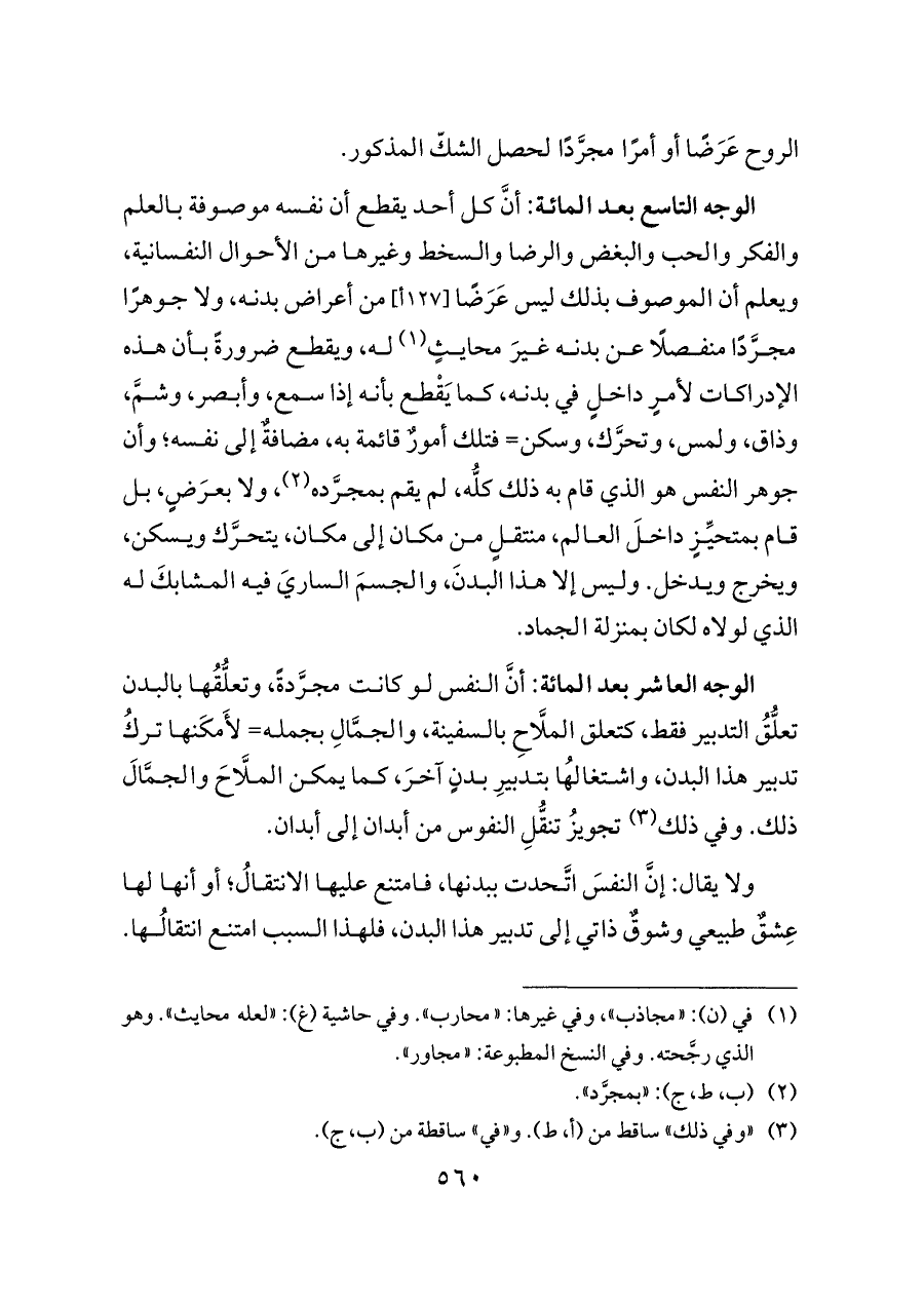الوجه العاشر بعد المائة: أنَّ النفس لو كانت مجرَّدةً، وتعلُّقُها بالبدن تعلُّقُ التدبير فقط، كتعلق الملَّاحِ بالسفينة، والجمَّالِ بجمله= لأَمكَنها تركُ تدبير هذا البدن، واشتغالُها بتدبيرِ بدنٍ آخرَ، كما يمكن الملَّاحَ والجمَّالَ ذلك. وفي ذلك (¬٣) تجويزُ تنقُّلِ النفوس من أبدان إلى أبدان.