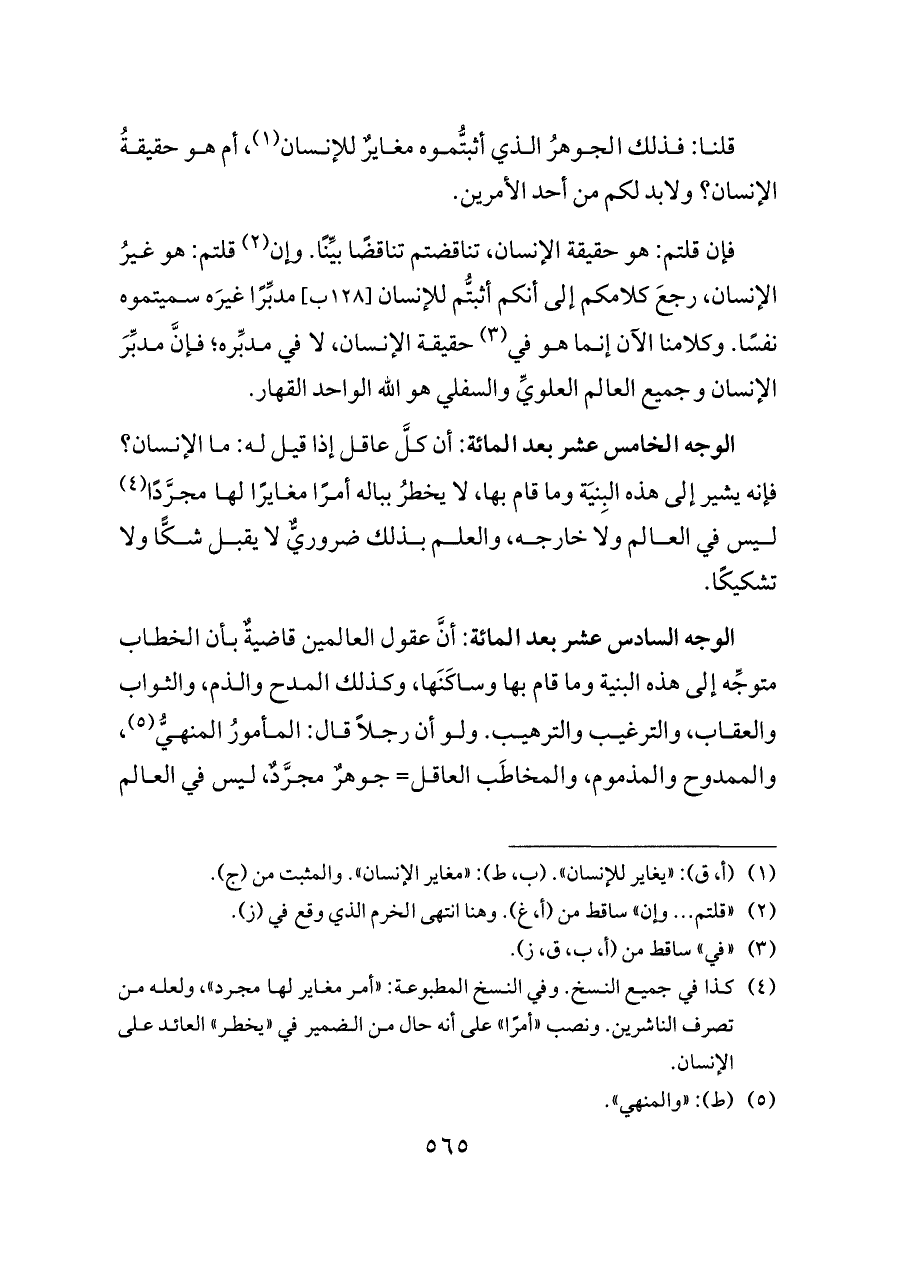 فإن قلتم: هو حقيقة الإنسان، تناقضتم تناقضًا بيِّنًا. وإن (¬٢) قلتم: هو غيرُ الإنسان، رجعَ كلامكم إلى أنكم أثبتُّم للإنسان [١٢٨ ب] مدبِّرًا غيرَه سميتموه نفسًا. وكلامنا الآن إنما هو في (¬٣) حقيقة الإنسان، لا في مدبِّره؛ فإنَّ مدبِّرَ الإنسان وجميع العالم العلويِّ والسفلي هو الله الواحد القهار.