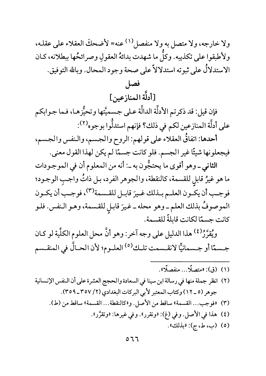 (¬٢) انظر جملة منها في رسالة ابن سينا في السعادة والحجج العشرة على أن النفس الإنسانية جوهر (٥ ــ ١٢) وكتاب المعتبر لأبي البركات البغدادي (٢/ ٣٥٧ ــ ٣٥٩).