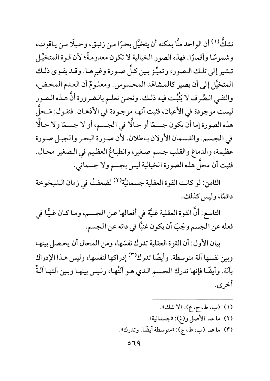 نشكُّ (¬١) أن الواحد منَّا يمكنه أن يتخيَّل بحرًا من زئبق، وجبلًا من ياقوت، وشموسًا وأقمارًا. فهذه الصور الخيالية لا تكون معدومةً؛ لأن قوة المتخيِّل تشير إلى تلك الصور، وتميِّز بين كلِّ صورة وغيرِها. وقد يقوى ذلك المتخيَّل إلى أن يصير كالمشاهَد المحسوس. ومعلومٌ أن العدم المحض، والنفي الصِّرف لا يَثْبُت فيه ذلك. ونحن نعلم بالضرورة أنَّ هذه الصور ليست موجودة في الأعيان، فثبت أنها موجودة في الأذهان. فنقول: مَحلُّ هذه الصورة إما أن يكون جسمًا أو حالًّا في الجسم، أو لا جسمًا ولا حالًّا في الجسم. والقسمان الأولان باطلان. لأن صورة البحر والجبل صورة عظيمة، والدماغ والقلب جسم صغير، وانطباعُ العظيم في الصغير محال. فثبت أن محلَّ هذه الصورة الخيالية ليس بجسم ولا جسماني.