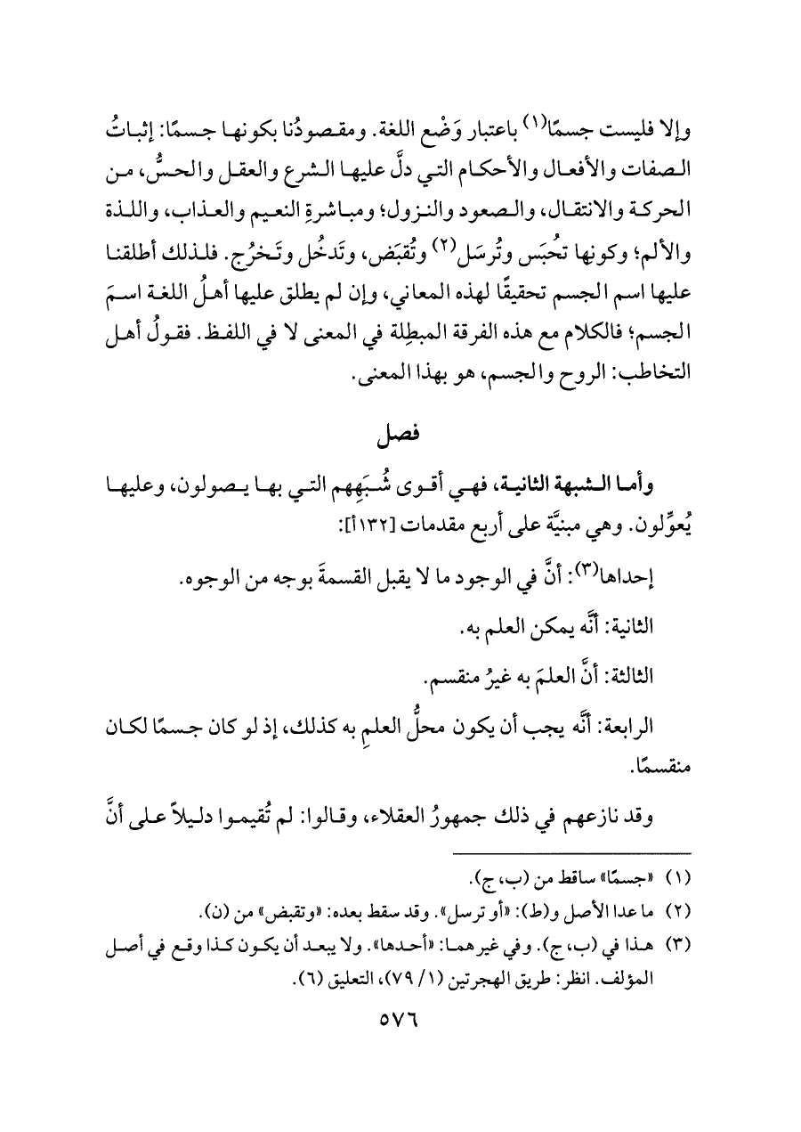 وأما الشبهة الثانية، فهي أقوى شُبَهِهم التي بها يصولون، وعليها يُعوِّلون. وهي مبنيَّة على أربع مقدمات [١٣٢ أ]: