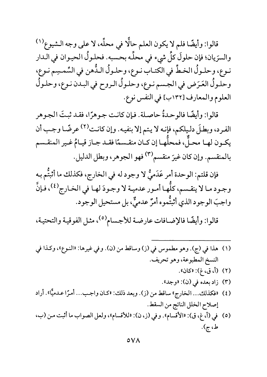 قالوا: وأيضًا فالوحدةُ حاصلة. فإن كانت جوهرًا، فقد ثبتَ الجوهر الفرد، وبطلَ دليلكم، فإنه لا يتم إلا بنفيه. وإن كانت (¬٢) عرضًا وجب أن يكون لها محلٌّ، فمحلُّها إن كان منقسمًا فقد جاز قيامُ غير المنقسم بالمنقسم. وإن كان غيرَ منقسم (¬٣) فهو الجوهر، وبطل الدليل.