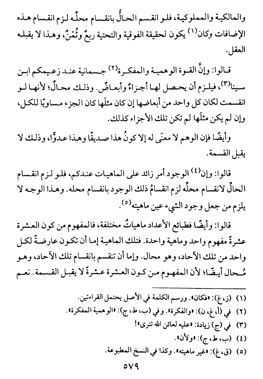 قالوا: وإنَّ القوة الوهمية والمفكرة (¬٢) جسمانية عند زعيمكم ابن سينا (¬٣)، فيلزم أن يحصل لها أجزاءٌ وأبعاضٌ. وذلك محالٌ؛ لأنها لو انقسمت لكان كل واحد من أبعاضها إن كان مثلَها كان الجزء مساويًا للكل، وإن لم يكن مثلَها لم تكن تلك الأجزاء كذلك.