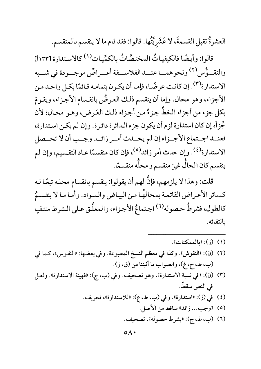 قالوا: وأيضًا فالكيفياتُ المختصَّاتُ بالكمِّيات (¬١) كالاستدارة [١٣٣ أ] والتقوُّس (¬٢) ونحوهما عند الفلاسفة أعراضٌ موجودة في شبه الاستدارة (¬٣). إن كانت عرضًا، فإما أن يكون بتمامه قائمًا بكل واحد من الأجزاء، وهو محال. وإما أن ينقسم ذلك العرضُ بانقسام الأجزاء، ويقومَ بكل جزء من أجزاء الخطِّ جزءٌ من أجزاء ذلك العَرض، وهو محال؛ لأن جُزأه إن كان استدارة لزم أن يكون جزء الدائرة دائرة. وإن لم يكن استدارة، فعند اجتماع الأجزاء إن لم يحدث أمر زائد وجب أن لا تحصل الاستدارة (¬٤). وإن حدث أمر زائد (¬٥)، فإن كان منقسمًا عاد التقسيم، وإن لم ينقسم كان الحالُّ غيرَ منقسم ومحلُّه منقسمًا.