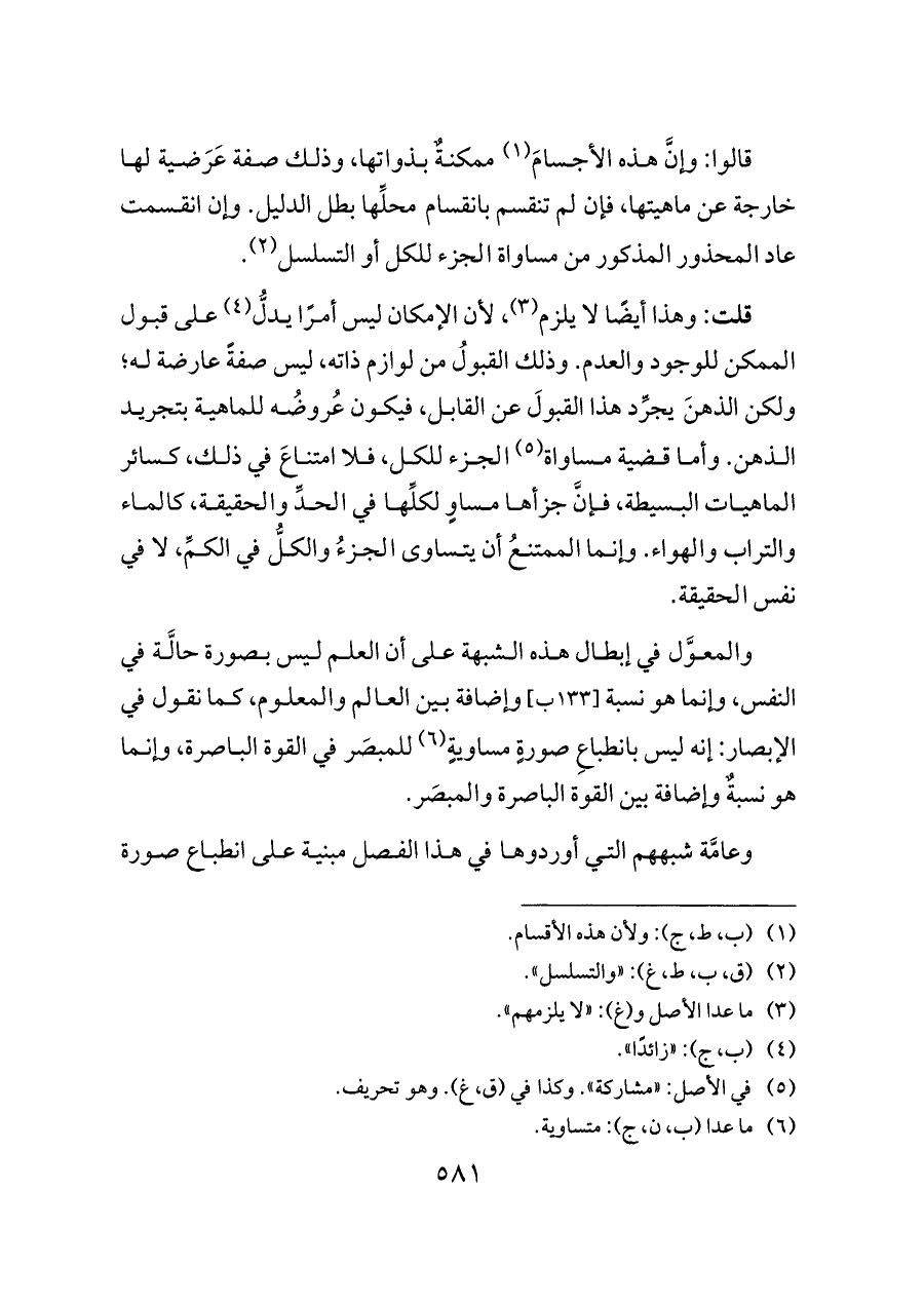 قلت: وهذا أيضًا لا يلزم (¬٣)، لأن الإمكان ليس أمرًا يدلُّ (¬٤) على قبول الممكن للوجود والعدم. وذلك القبولُ من لوازم ذاته، ليس صفةً عارضة له؛ ولكن الذهنَ يجرِّد هذا القبولَ عن القابل، فيكون عُروضُه للماهية بتجريد الذهن. وأما قضية مساواة (¬٥) الجزء للكل، فلا امتناعَ في ذلك، كسائر الماهيات البسيطة، فإنَّ جزأها مساوٍ لكلِّها في الحدِّ والحقيقة، كالماء والتراب والهواء. وإنما الممتنعُ أن يتساوى الجزءُ والكلُّ في الكمِّ، لا في نفس الحقيقة.