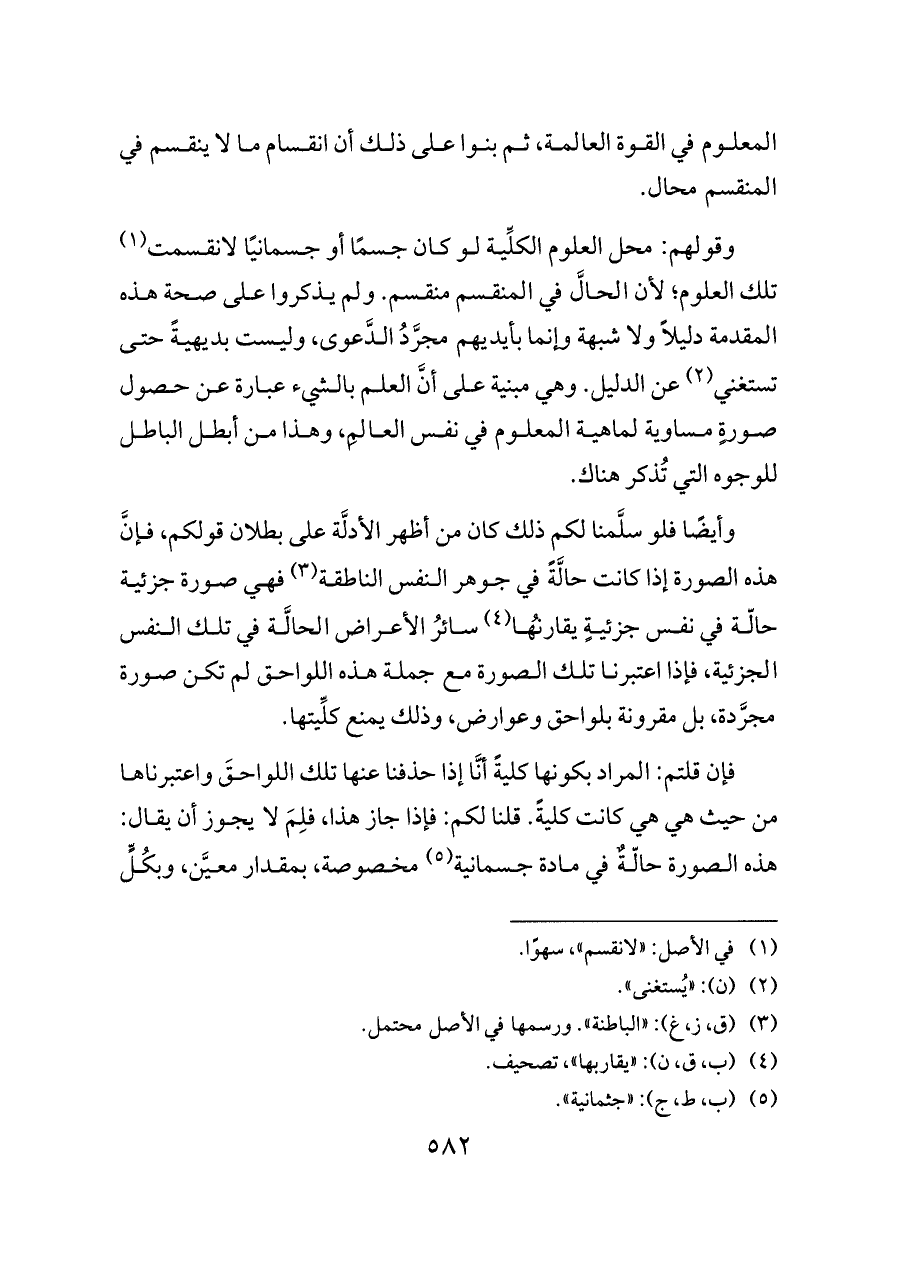 وقولهم: محل العلوم الكلِّية لو كان جسمًا أو جسمانيًا لانقسمت (¬١) تلك العلوم؛ لأن الحالَّ في المنقسم منقسم. ولم يذكروا على صحة هذه المقدمة دليلاً ولا شبهة وإنما بأيديهم مجرَّدُ الدَّعوى، وليست بديهيةً حتى تستغني (¬٢) عن الدليل. وهي مبنية على أنَّ العلم بالشيء عبارة عن حصول صورةٍ مساوية لماهية المعلوم في نفس العالِم، وهذا من أبطل الباطل للوجوه التي تُذكر هناك.