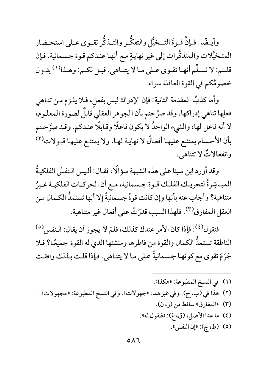 وأيضًا: فإنَّ قوةَ التخيُّل والتفكُّر والتذكُّر تقوى على استحضار المتخيَّلات والمتذكَّرات إلى غير نهايةٍ مع أنها عندكم قوة جسمانية. فإن قلتم: لا نسلِّم أنها تقوى على ما لا يتناهى. قيل لكم: وهذا (¬١) يقول خصومُكم في القوة العاقلة سواء.