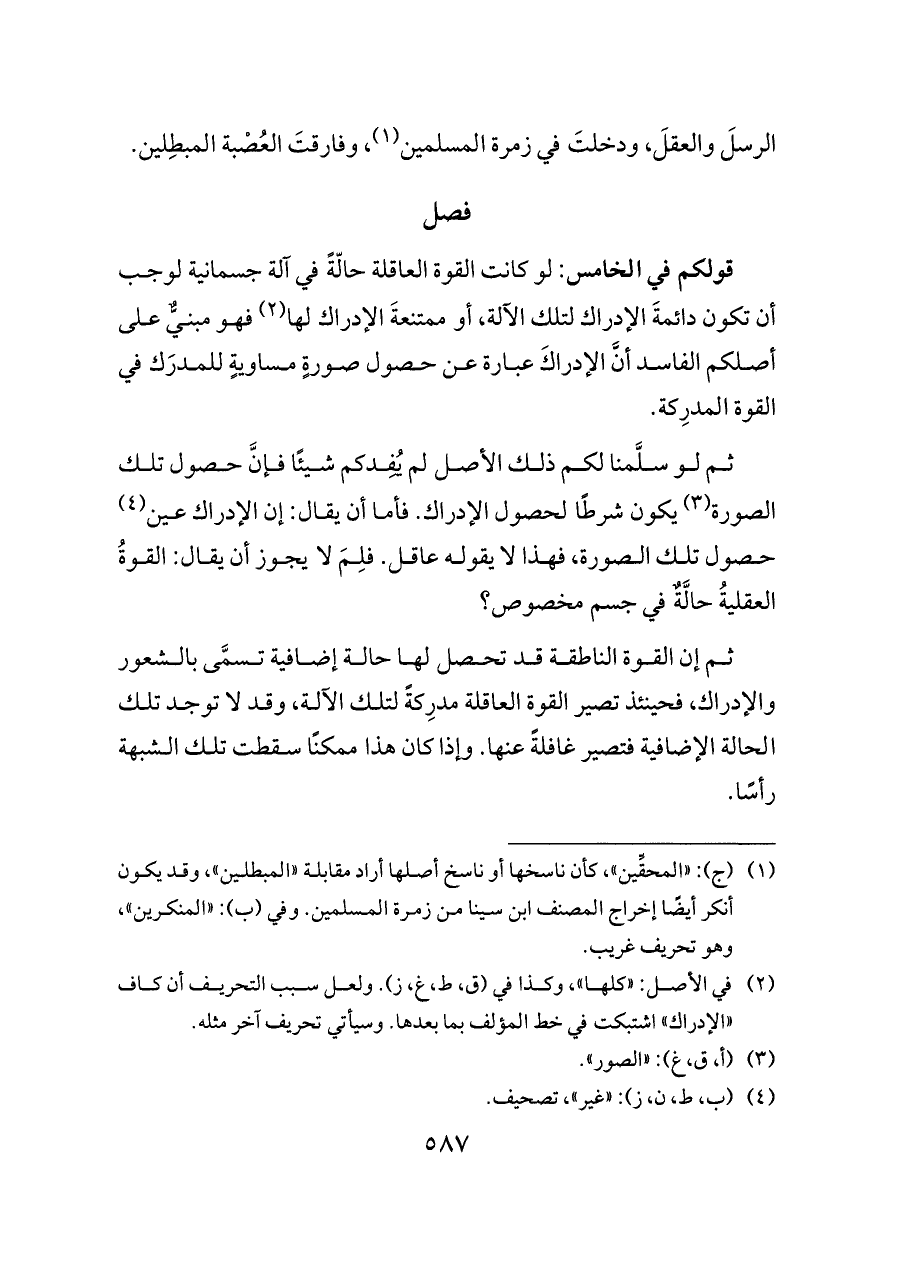 (¬١) (ج): «المحقِّين»، كأن ناسخها أو ناسخ أصلها أراد مقابلة «المبطلين»، وقد يكون أنكر أيضًا إخراج المصنف ابن سينا من زمرة المسلمين. وفي (ب): «المنكرين»، وهو تحريف غريب.