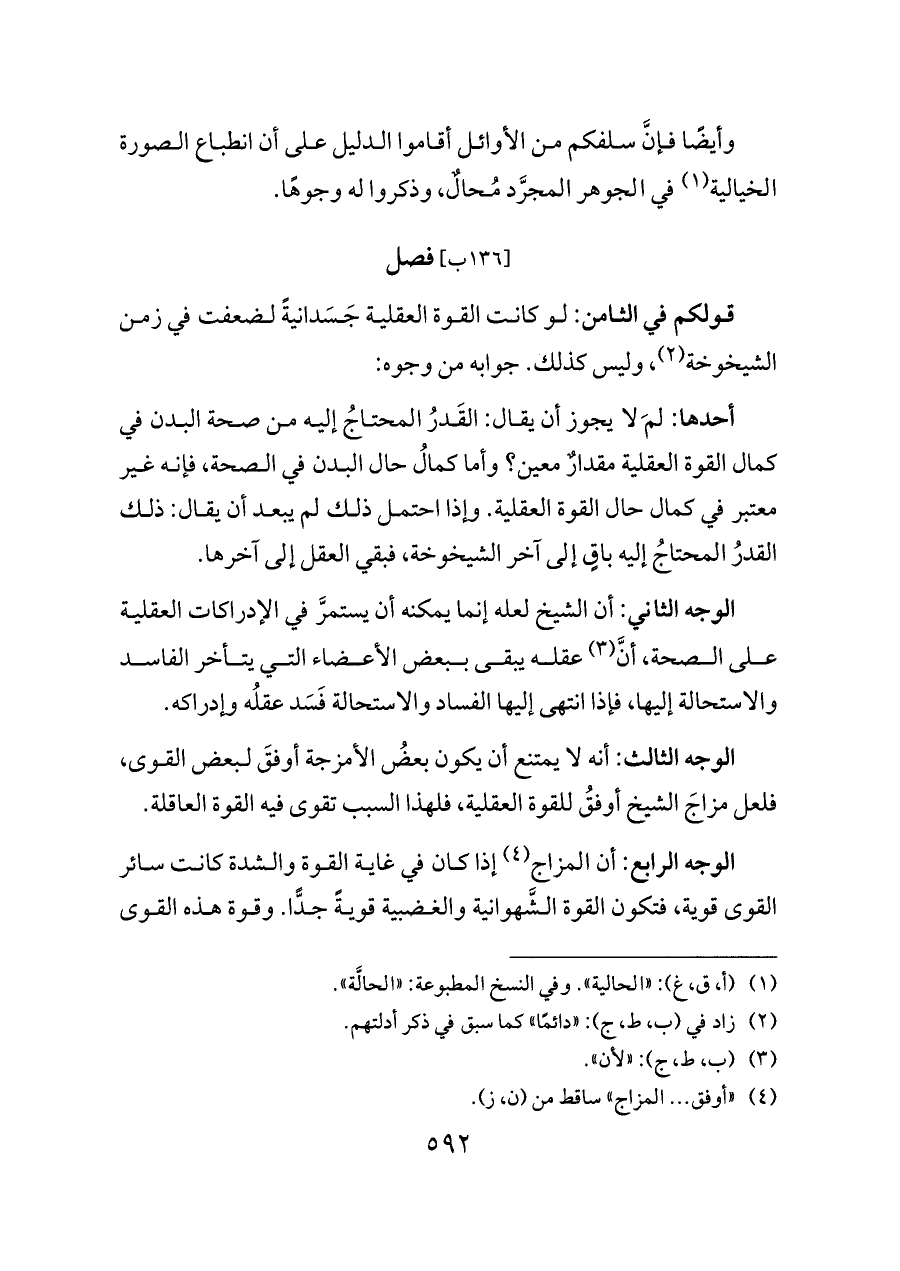 الوجه الثاني: أن الشيخ لعله إنما يمكنه أن يستمرَّ في الإدراكات العقلية على الصحة، أنَّ (¬٣) عقله يبقى ببعض الأعضاء التي يتأخر الفاسد والاستحالة إليها، فإذا انتهى إليها الفساد والاستحالة فَسَد عقلُه وإدراكه.