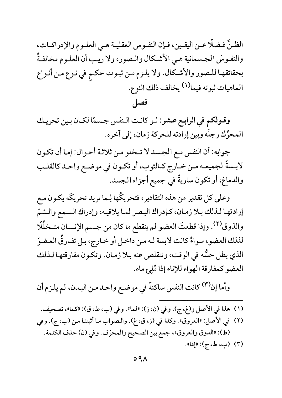 وقولكم في الرابع عشر: لو كانت النفس جسمًا لكان بين تحريك المحرِّك رجلَه وبين إرادته للحركة زمان، إلى آخره.