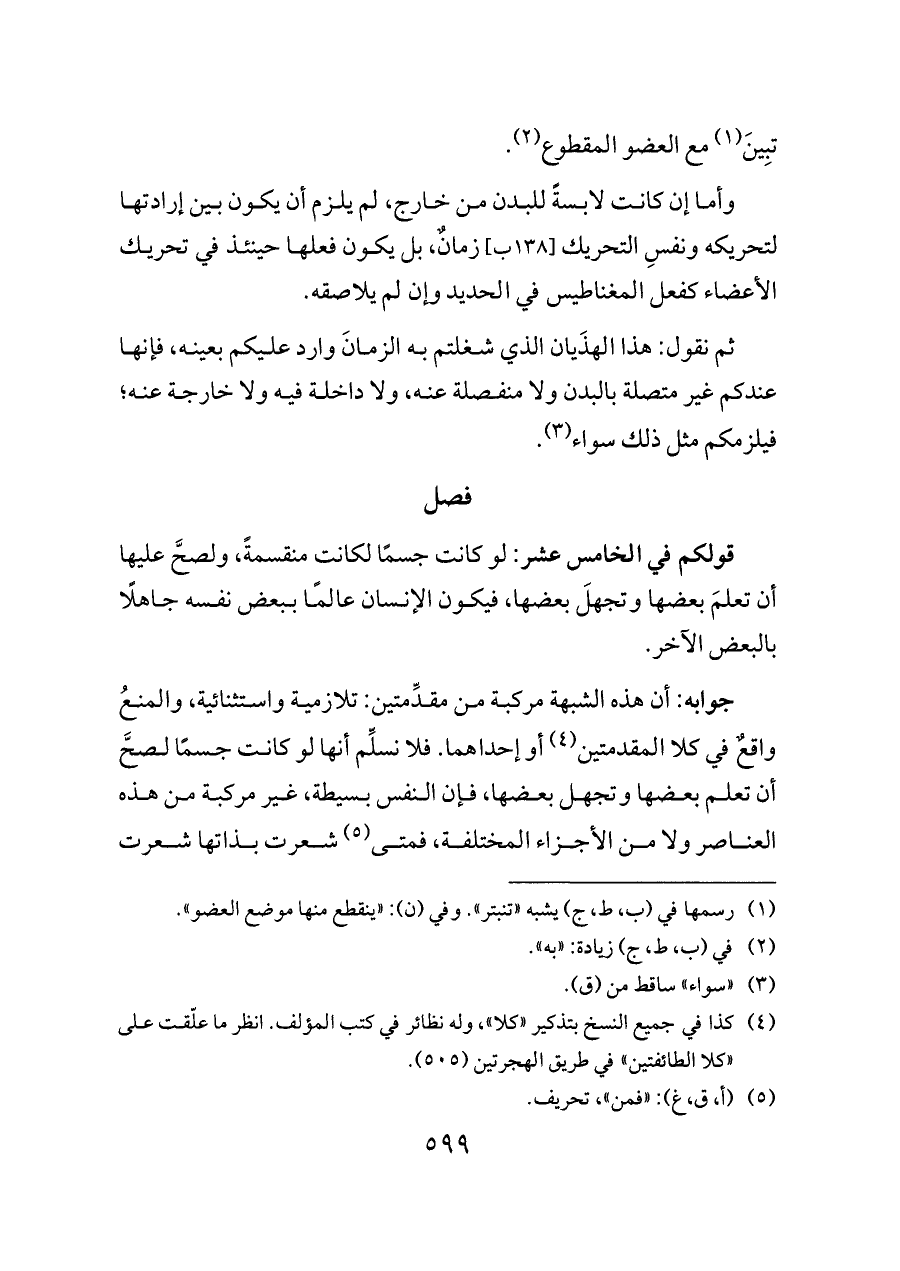 قولكم في الخامس عشر: لو كانت جسمًا لكانت منقسمةً، ولصحَّ عليها أن تعلمَ بعضها وتجهلَ بعضها، فيكون الإنسان عالمًا ببعض نفسه جاهلًا بالبعض الآخر.