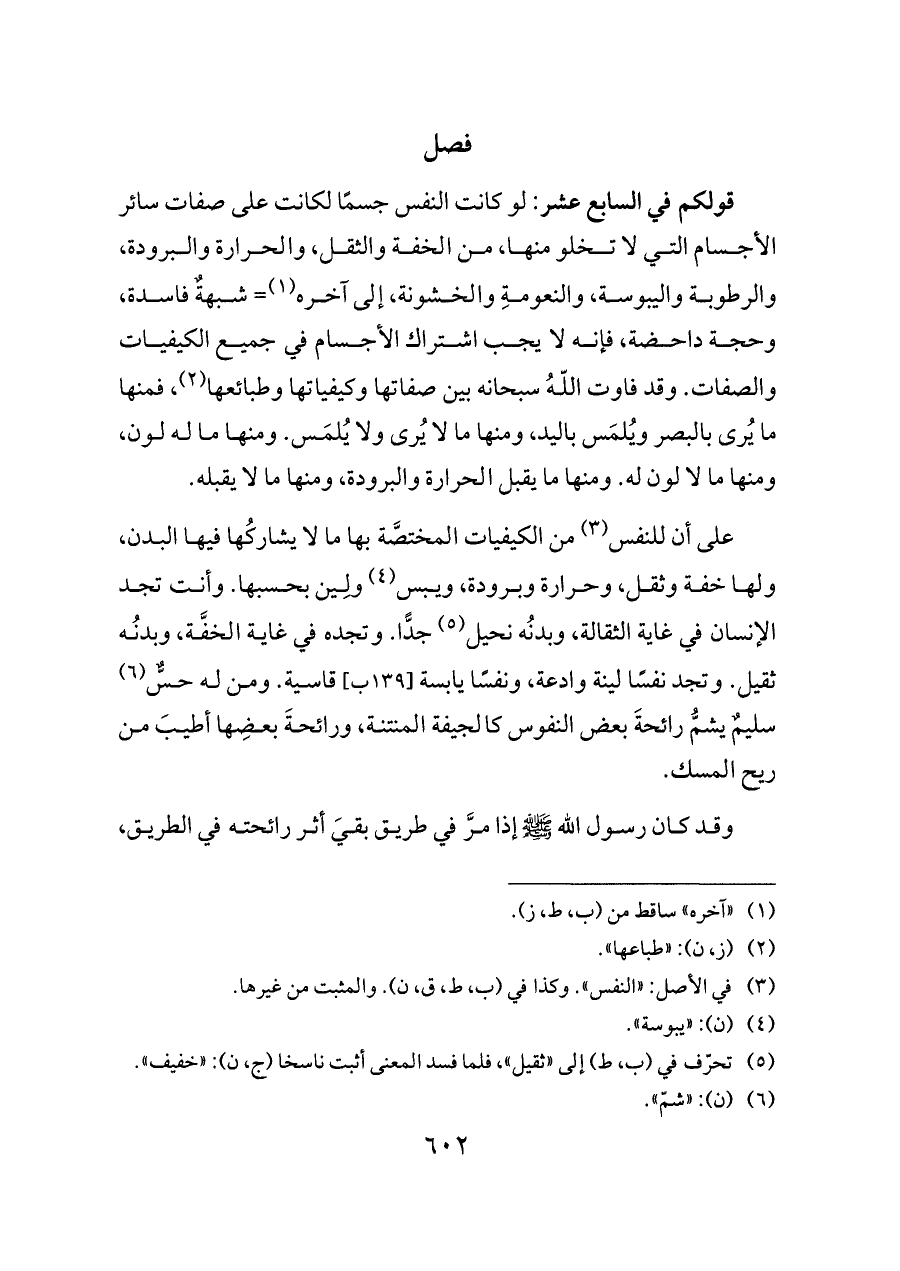 على أن للنفس (¬٣) من الكيفيات المختصَّة بها ما لا يشاركُها فيها البدن، ولها خفة وثقل، وحرارة وبرودة، ويبس (¬٤) ولِين بحسبها. وأنت تجد الإنسان في غاية الثقالة، وبدنُه نحيل (¬٥) جدًّا. وتجده في غاية الخفَّة، وبدنُه ثقيل. وتجد نفسًا لينة وادعة، ونفسًا يابسة [١٣٩ ب] قاسية. ومن له حسٌّ (¬٦) سليمٌ يشمُّ رائحةَ بعض النفوس كالجيفة المنتنة، ورائحةَ بعضِها أطيبَ من ريح المسك.