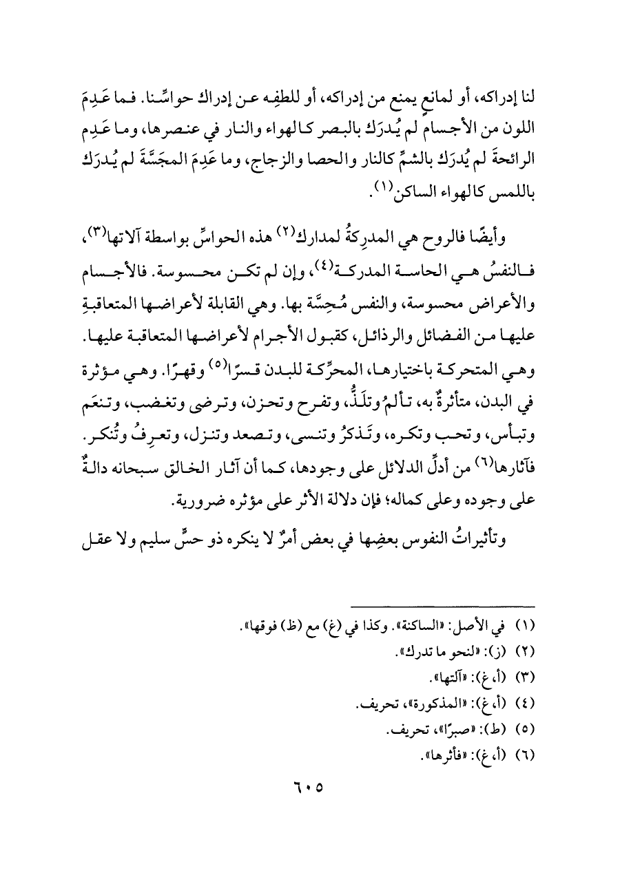 لنا إدراكه، أو لمانعٍ يمنع من إدراكه، أو للطفِه عن إدراك حواسِّنا. فما عَدِمَ اللون من الأجسام لم يُدرَك بالبصر كالهواء والنار في عنصرها، وما عَدِم الرائحةَ لم يُدرَك بالشمِّ كالنار والحصا والزجاج، وما عَدِمَ المجَسَّةَ لم يُدرَك باللمس كالهواء الساكن (¬١).