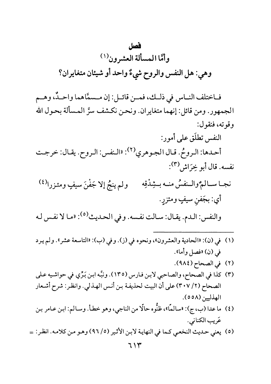 وهي: هل النفس والروح شيءٌ واحد أو شيئان متغايران؟