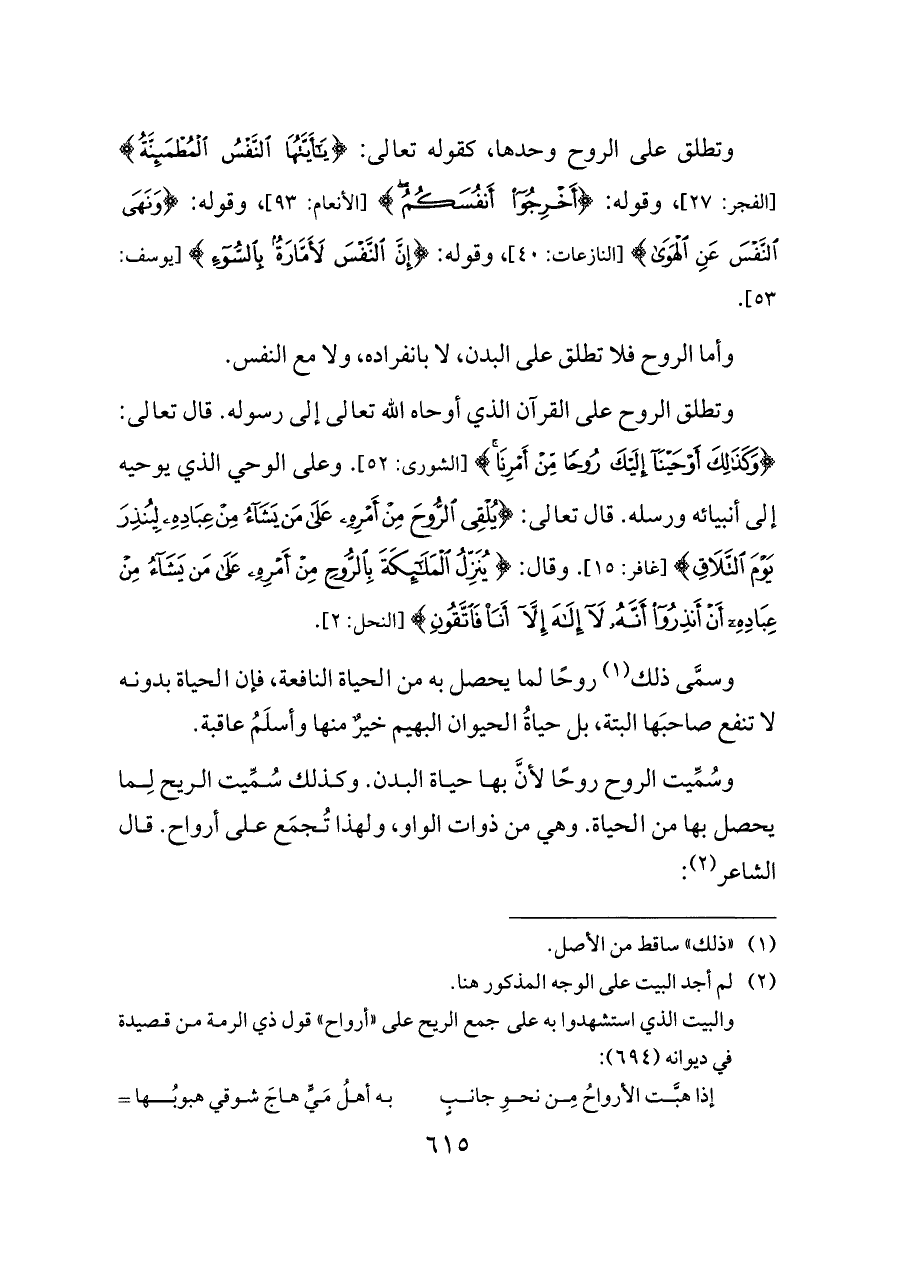وسُمِّيت الروح روحًا لأنَّ بها حياة البدن. وكذلك سُمِّيت الريح لِما يحصل بها من الحياة. وهي من ذوات الواو، ولهذا تُجمَع على أرواح. قال الشاعر (¬٢):