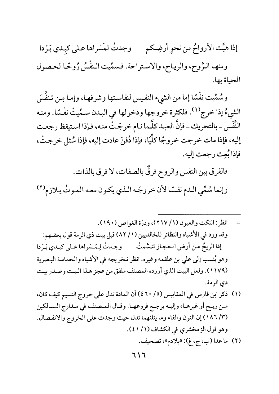(¬١) ذكر ابن فارس في المقاييس (٥/ ٤٦٠) أن المادة تدل على خروج النسيم كيف كان، من ريح أو غيرها، وإليه يرجع فروعها. وقال المصنف في مدارج السالكين (٣/ ١٨٦) إن النون والفاء وما يثلثهما تدل حيث وجدت على الخروج والانفصال. وهو قول الزمخشري في الكشاف (١/ ٤١).