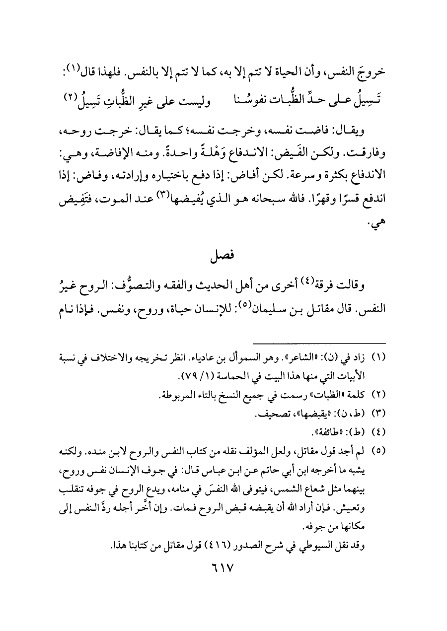 (¬٥) لم أجد قول مقاتل، ولعل المؤلف نقله من كتاب النفس والروح لابن منده. ولكنه يشبه ما أخرجه ابن أبي حاتم عن ابن عباس قال: في جوف الإنسان نفس وروح، بينهما مثل شعاع الشمس، فيتوفى الله النفسَ في منامه، ويدع الروح في جوفه تنقلب وتعيش. فإن أراد الله أن يقبضه قبض الروح فمات. وإن أخَّر أجله ردَّ النفس إلى مكانها من جوفه.