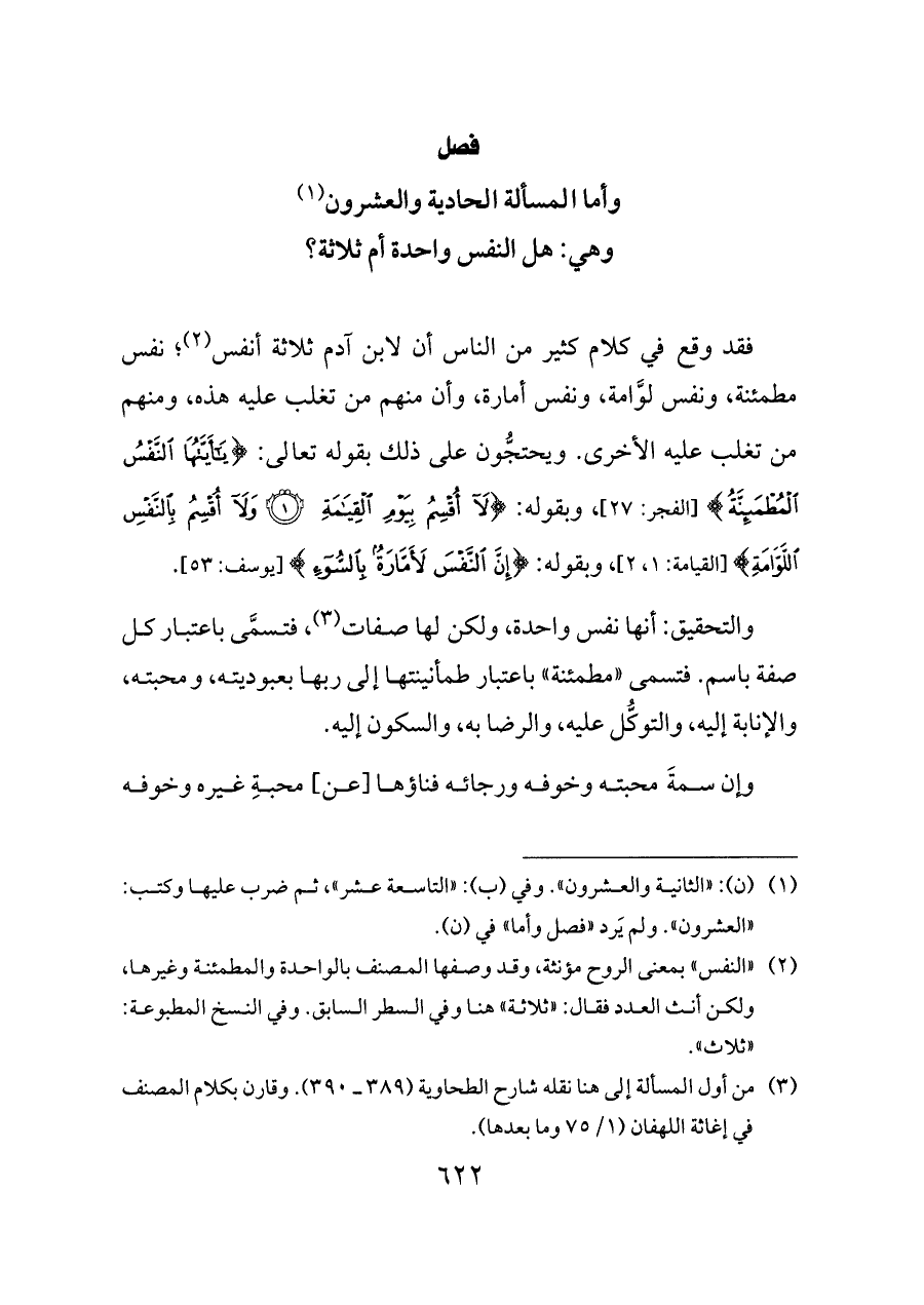 (¬٢) «النفس» بمعنى الروح مؤنثة، وقد وصفها المصنف بالواحدة والمطمئنة وغيرها، ولكن أنث العدد فقال: «ثلاثة» هنا وفي السطر السابق. وفي النسخ المطبوعة: «ثلاث».