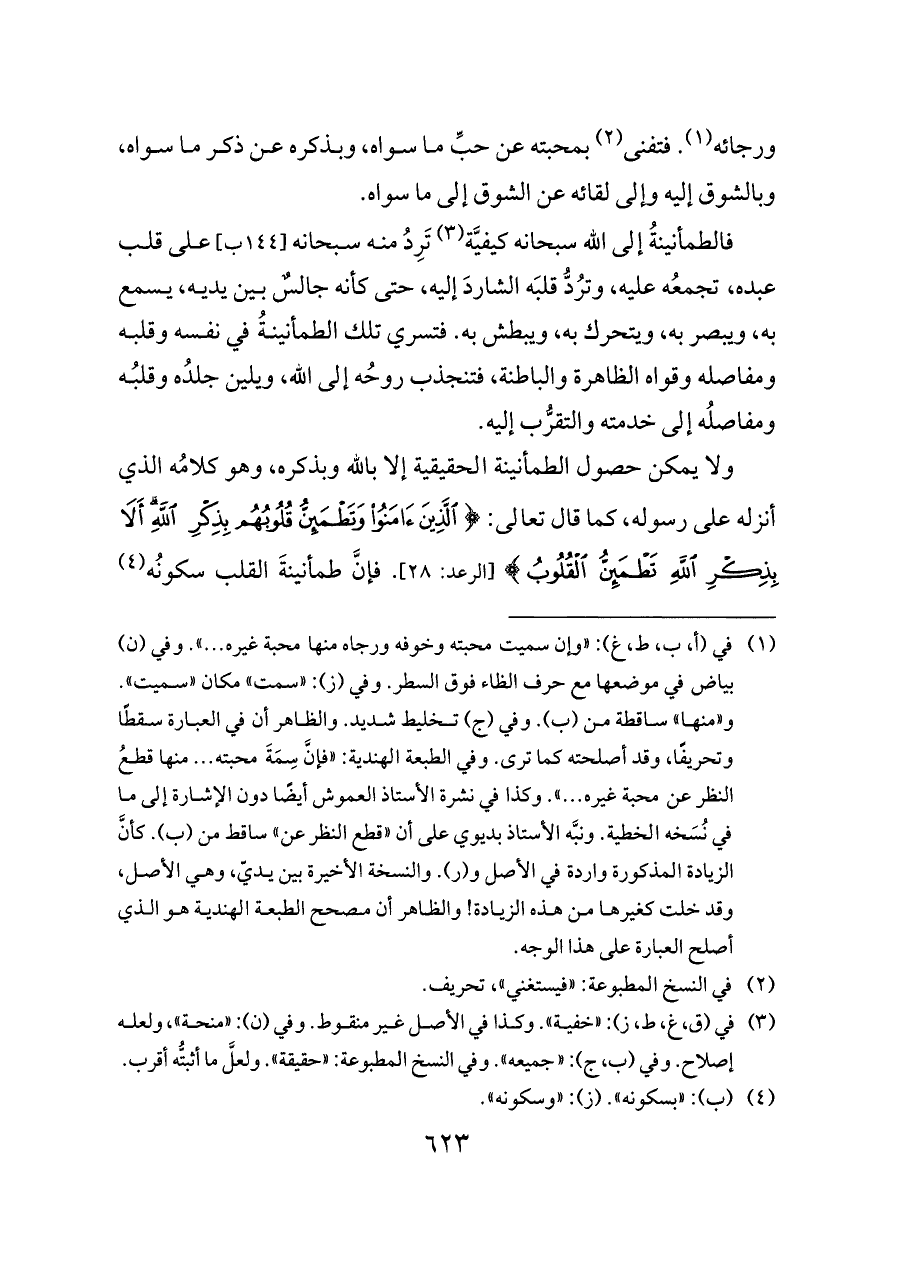 (¬١) في (أ، ب، ط، غ): «وإن سميت محبته وخوفه ورجاه منها محبة غيره ... ». وفي (ن) بياض في موضعها مع حرف الظاء فوق السطر. وفي (ز): «سمت» مكان «سميت». و «منها» ساقطة من (ب). وفي (ج) تخليط شديد. والظاهر أن في العبارة سقطًا وتحريفًا، وقد أصلحته كما ترى. وفي الطبعة الهندية: «فإنَّ سِمَةَ محبته ... منها قطعُ النظر عن محبة غيره ... ». وكذا في نشرة الأستاذ العموش أيضًا دون الإشارة إلى ما في نُسَخه الخطية. ونبَّه الأستاذ بديوي على أن «قطع النظر عن» ساقط من (ب). كأنَّ الزيادة المذكورة واردة في الأصل و (ر). والنسخة الأخيرة بين يديّ، وهي الأصل، وقد خلت كغيرها من هذه الزيادة! والظاهر أن مصحح الطبعة الهندية هو الذي أصلح العبارة على هذا الوجه.