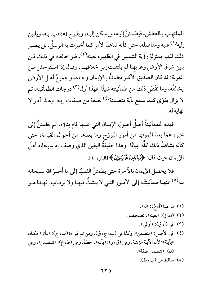 فهذه الطمأنينةُ أصلُ أصولِ الإيمان التي عليها قام بناؤه. ثم يطمئنُّ إلى خبره عما بعدَ الموتِ من أمور البرزخ وما بعدها من أحوال القيامة، حتى كأنه يشاهدُ ذلك كلَّه عِيانًا. وهذا حقيقةُ اليقين الذي وصف به سبحانه أهلَ الإيمان حيث قال: {وَبِالْآخِرَةِ هُمْ يُوقِنُونَ} [البقرة: ٤].