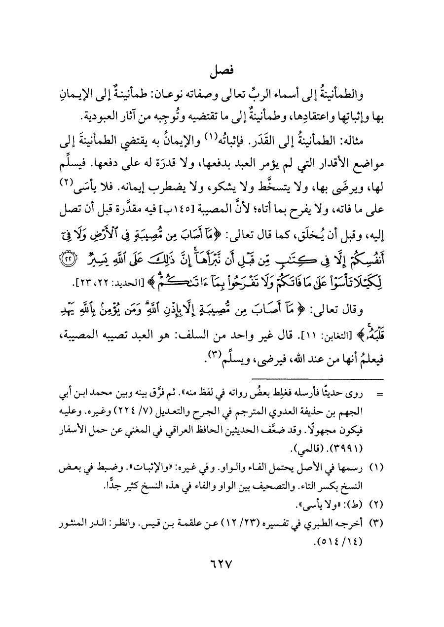 مثاله: الطمأنينةُ إلى القَدَر. فإثباتُه (¬١) والإيمانُ به يقتضي الطمأنينةَ إلى مواضع الأقدار التي لم يؤمر العبد بدفعها، ولا قدرَة له على دفعها. فيسلِّم لها، ويرضَى بها، ولا يتسخَّط ولا يشكو، ولا يضطرب إيمانه. فلا يأسَى (¬٢) على ما فاته، ولا يفرح بما أتاه؛ لأنَّ المصيبة [١٤٥ ب] فيه مقدَّرة قبل أن تصل إليه، وقبل أن يُخلَق، كما قال تعالى: {مَا أَصَابَ مِنْ مُصِيبَةٍ فِي الْأَرْضِ وَلَا فِي أَنْفُسِكُمْ إِلَّا فِي كِتَابٍ مِنْ قَبْلِ أَنْ نَبْرَأَهَا إِنَّ ذَلِكَ عَلَى اللَّهِ يَسِيرٌ (٢٢) لِكَيْلَا تَأْسَوْا عَلَى مَا فَاتَكُمْ وَلَا تَفْرَحُوا بِمَا آتَاكُمْ} [الحديد: ٢٢، ٢٣].