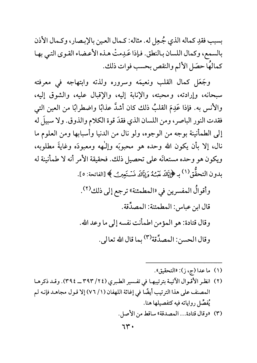 وجَعَل كمال القلب ونعيمَه وسروره ولذته وابتهاجه في معرفته سبحانه، وإرادته، ومحبته، والإنابة إليه، والإقبال عليه، والشوق إليه، والأنس به. فإذا عَدِمَ القلبُ ذلك كان أشدَّ عذابًا واضطرابًا من العين التي فقدت النور الباصر، ومن اللسان الذي فقدَ قوة الكلام والذوق. ولا سبيلَ له إلى الطمأنينة بوجه من الوجوه، ولو نال من الدنيا وأسبابها ومن العلوم ما نال، إلا بأن يكون الله وحده هو محبوبَه وإلاهه ومعبودَه وغايةَ مطلوبه، ويكون هو وحده مستعانَه على تحصيل ذلك. فحقيقة الأمر أنه لا طمأنينة له بدون التحقُّق (¬١) بـ {إِيَّاكَ نَعْبُدُ وَإِيَّاكَ نَسْتَعِينُ} [الفاتحة: ٥].