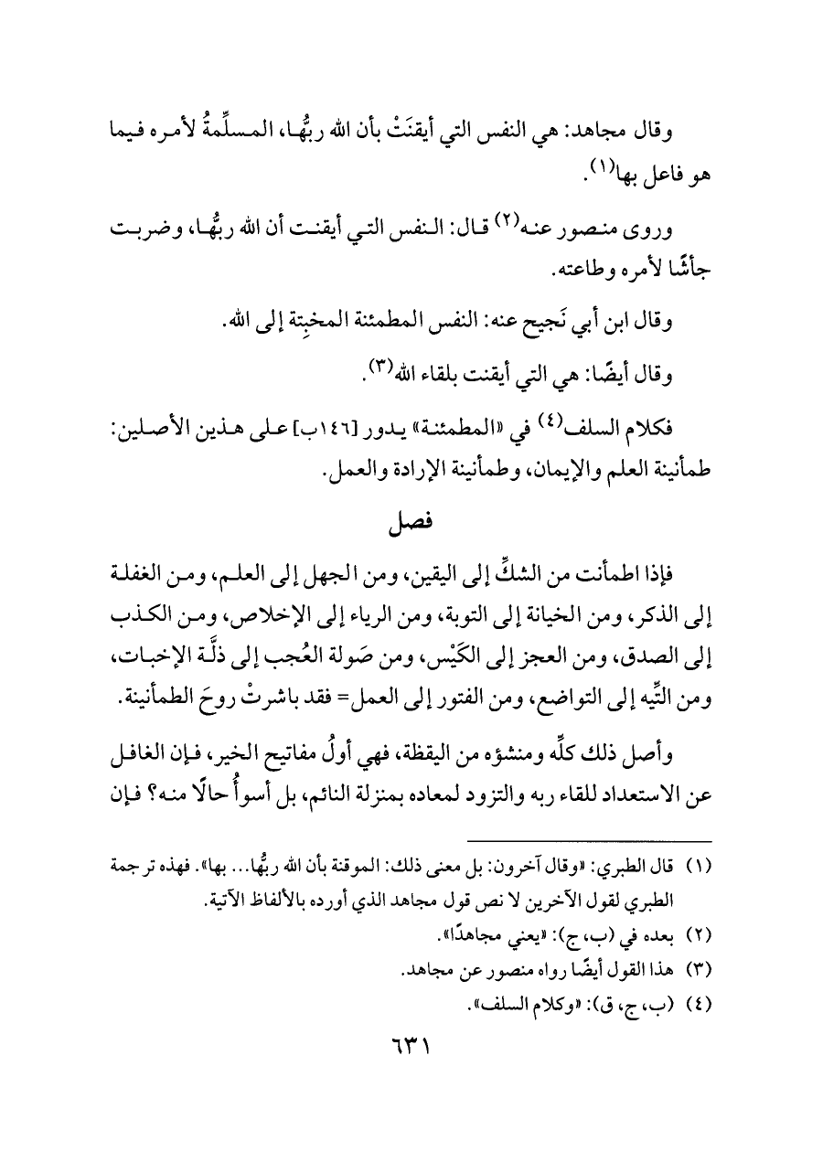 فكلام السلف (¬٤) في «المطمئنة» يدور [١٤٦ ب] على هذين الأصلين: طمأنينة العلم والإيمان، وطمأنينة الإرادة والعمل.